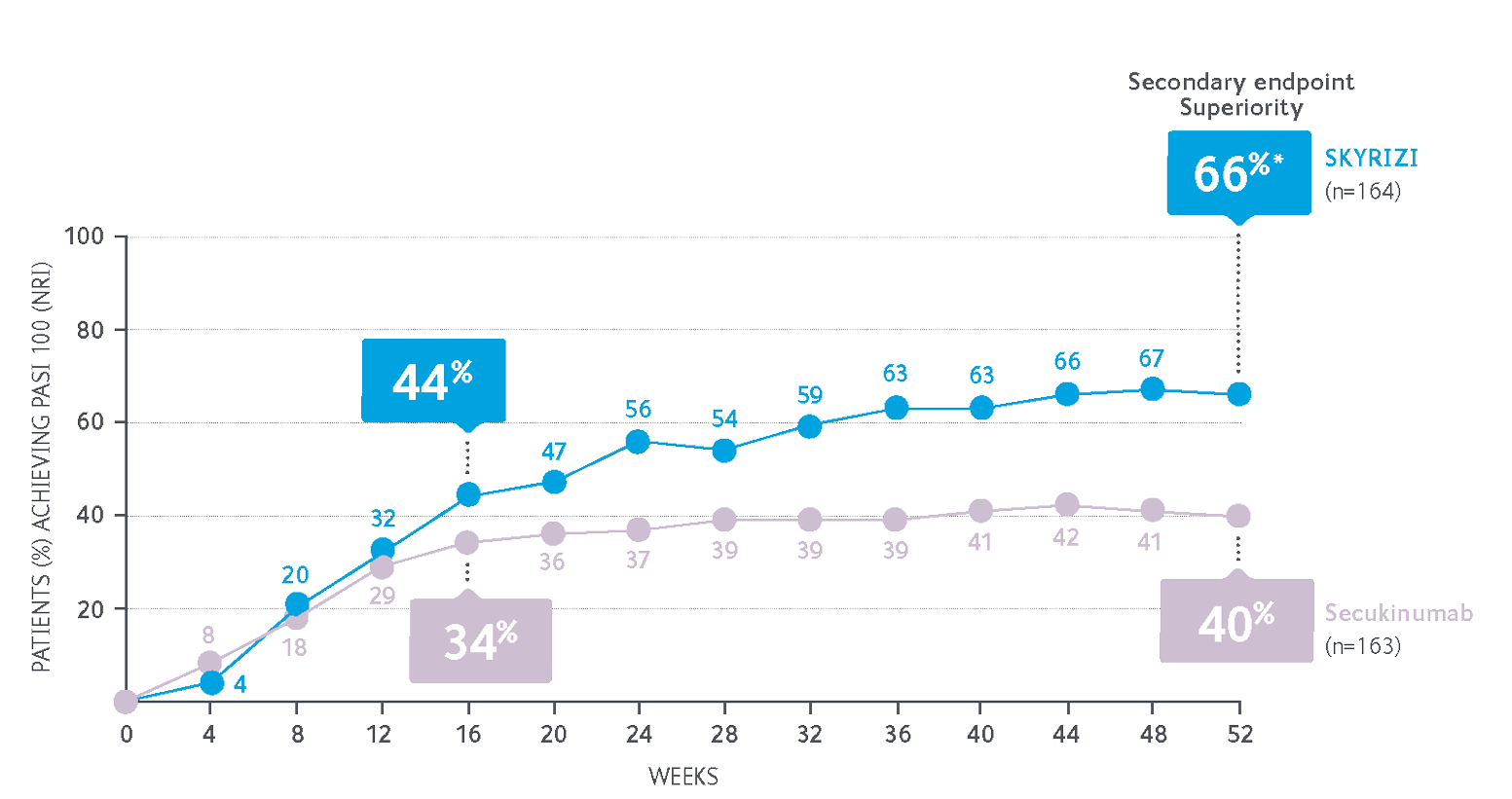 All ranked secondary endpoints were met, including statistically significant superiority of SKYRIZI vs secukinumab at Week 52 (PASI 100: 66% vs 40%, P<0.001). Co-primary endpoints were met: PASI 90 at Week 16 (non-inferiority) and PASI 90 at Week 52 (superiority).