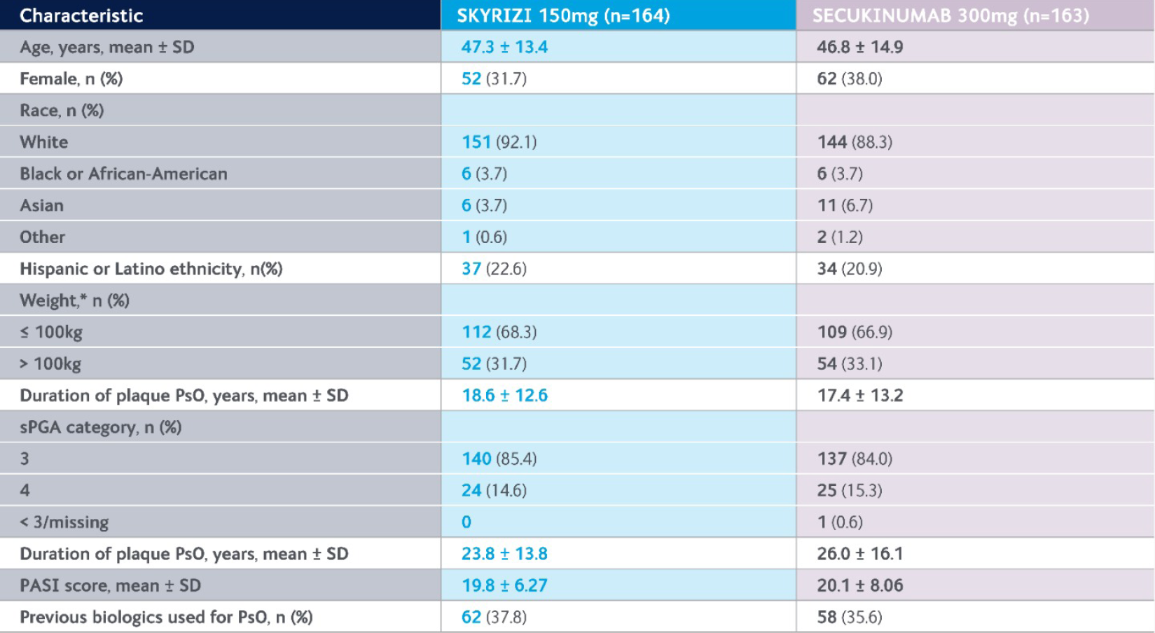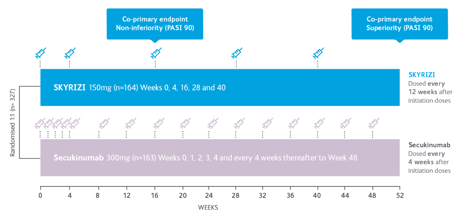 A total of 327 subjects were randomised 1:1 to SKYRIZI (n=164) (150 mg), given as two 75-mg subcutaneous injections at baseline, 4 weeks later, and every 12 weeks thereafter, or secukinumab (n=163) (300 mg) given as two 150-mg subcutaneous injections, at baseline, weeks 1, 2, 3, and 4, and then every 4 weeks thereafter.