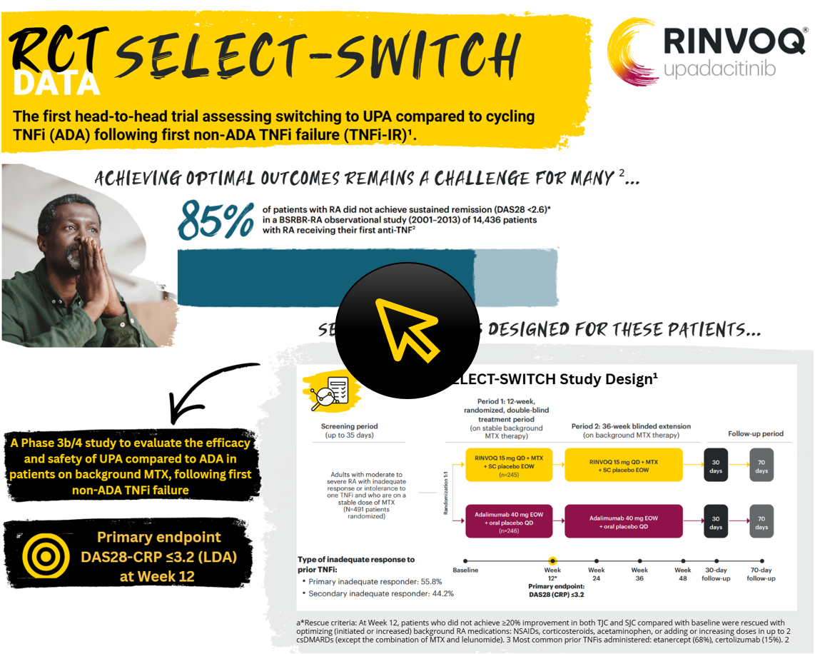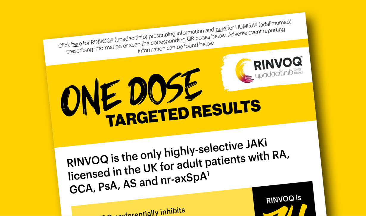 This promotional material is intended for UK Healthcare Professionals experienced in the diagnosis and treatment of rheumatological conditions. Specialist prescribing only: RINVOQ (upadacitinib) and HUMIRA (adalimumab) Prescribing Information and adverse event reporting information can be found below.