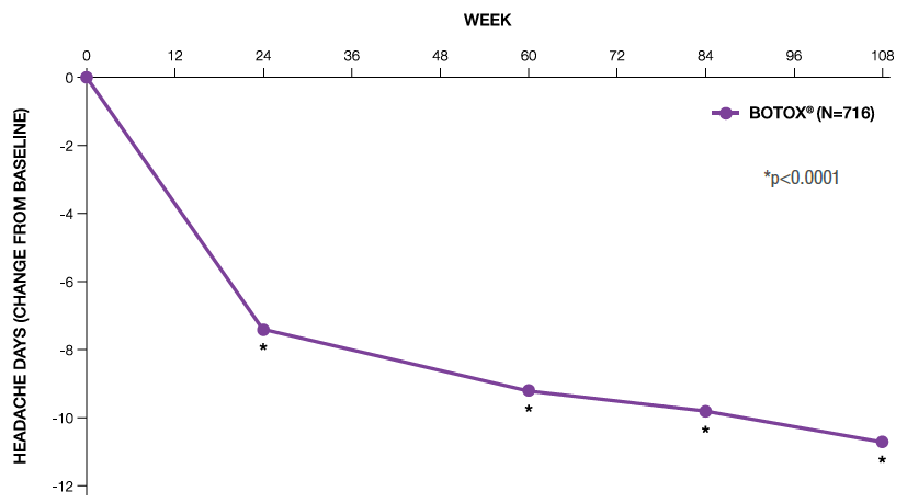 - In a 2-year open-label study, BOTOX® progressively reduced headache days from baseline up to 2 years (-10.7 days, p<0.0001; N=716). Patients reported an average of 22 headache days per month at baseline4