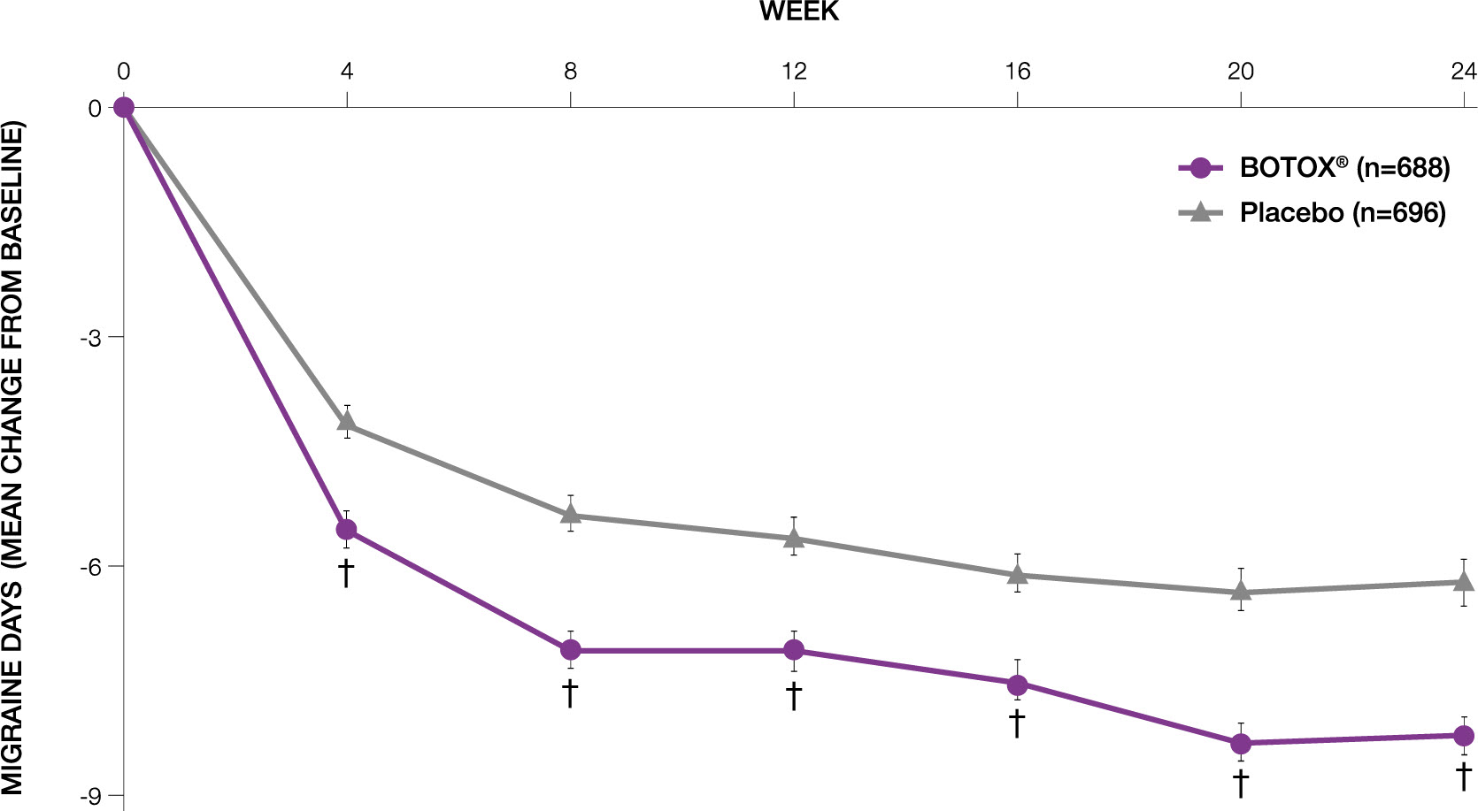 - BOTOX® significantly reduces the frequency of migraine days compared with placebo up to 24 weeks (p<0.001; N=1,384)7