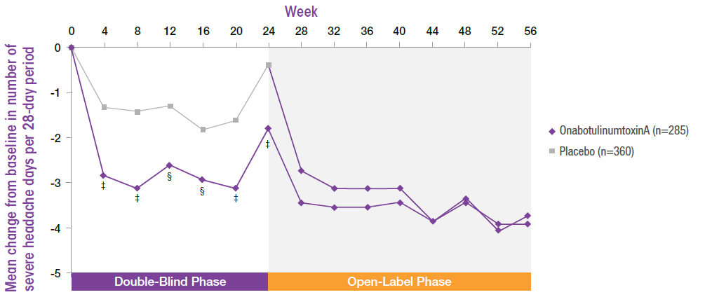 Pooled analysis of the two multicentre pivotal trials (PREEMPT), with a 24-week randomised, double-blind phase followed by a 32-week open-label phase. Patients were randomised (1:1) to BOTOX® (155-195 U) or placebo injections every 12 weeks. The primary endpoint for the pooled analysis was mean change from baseline in frequency of headache days for the 28-day period ending with week 24.7