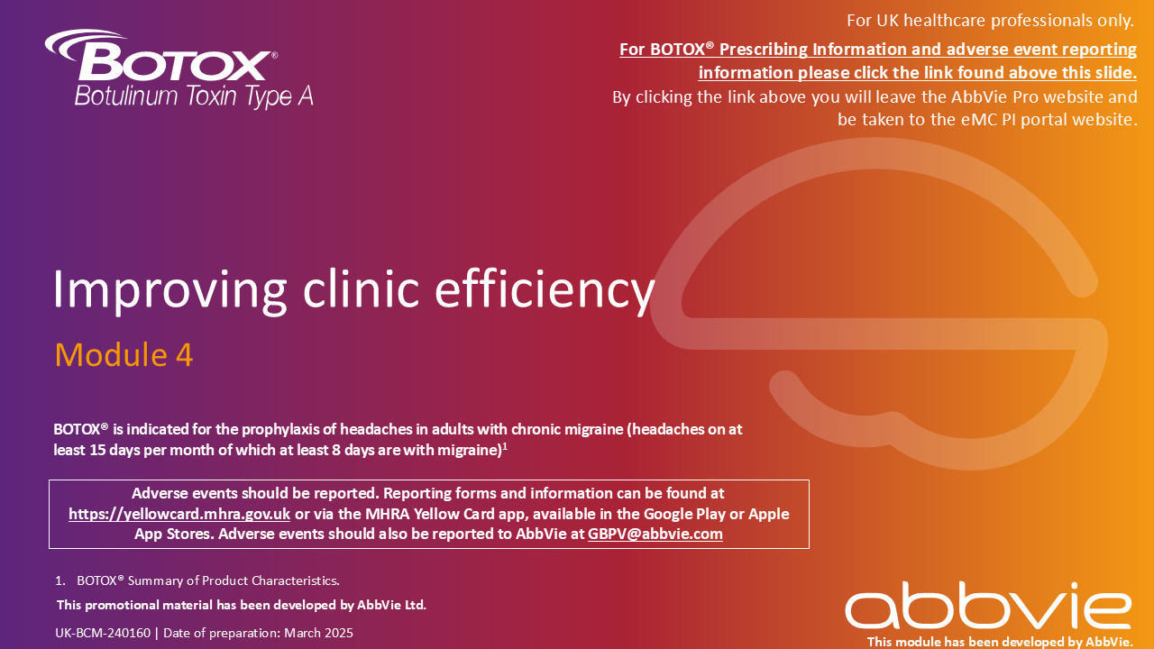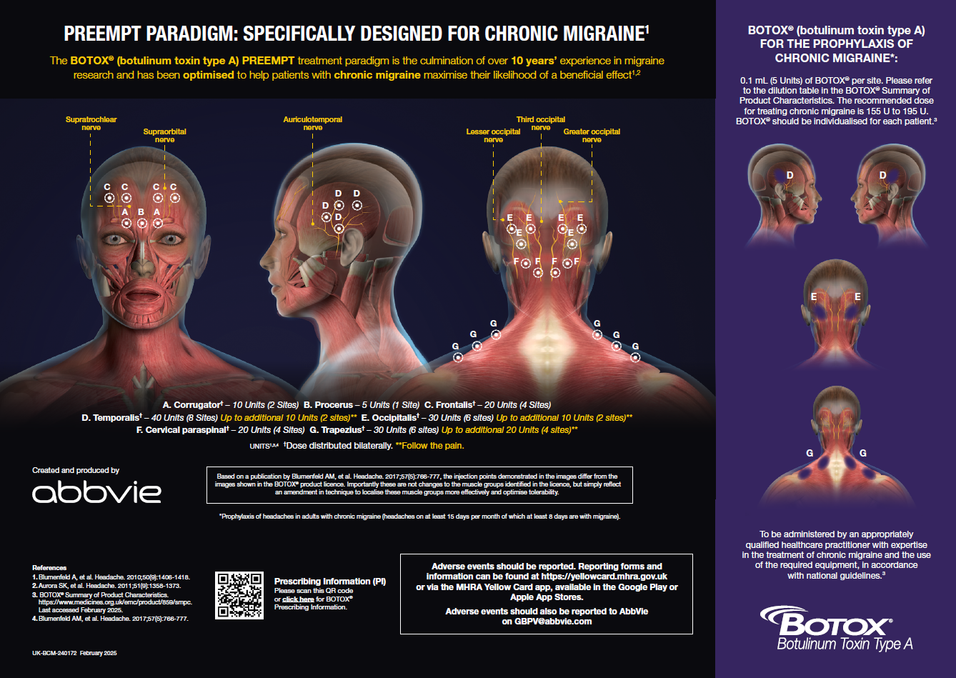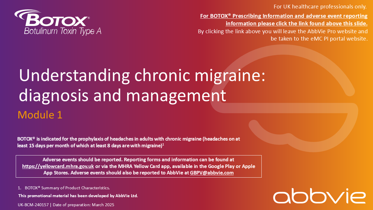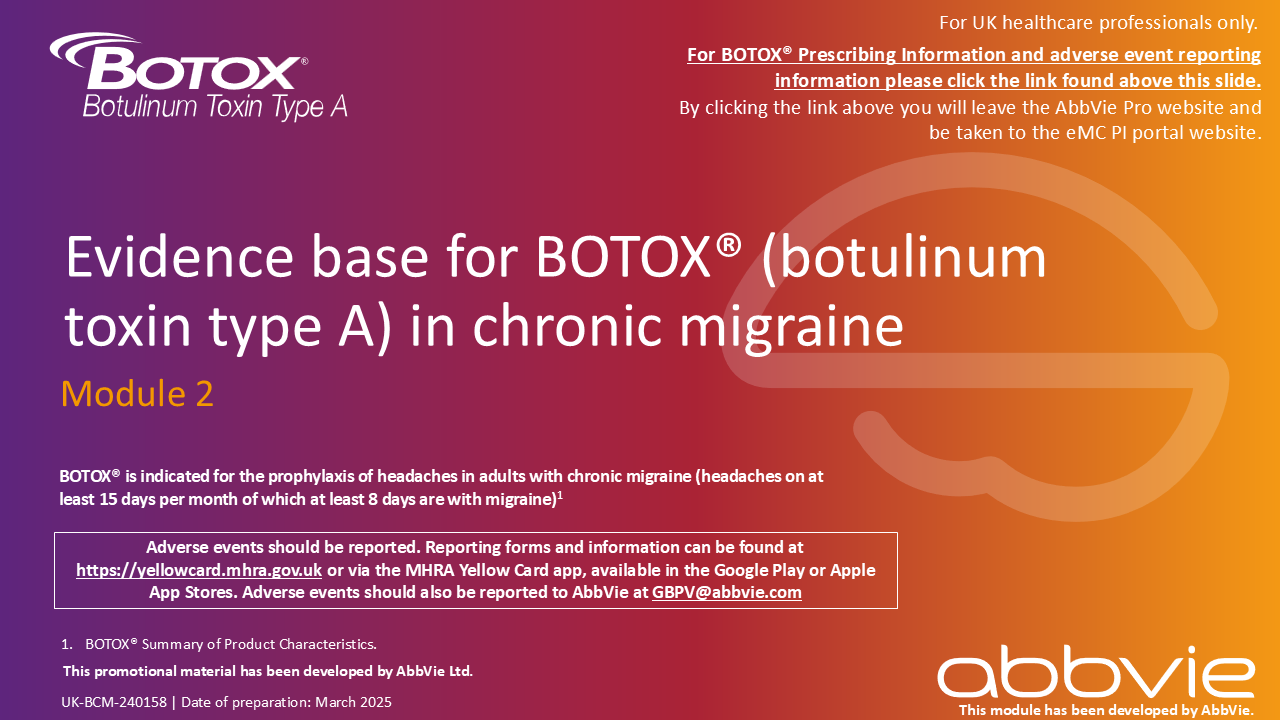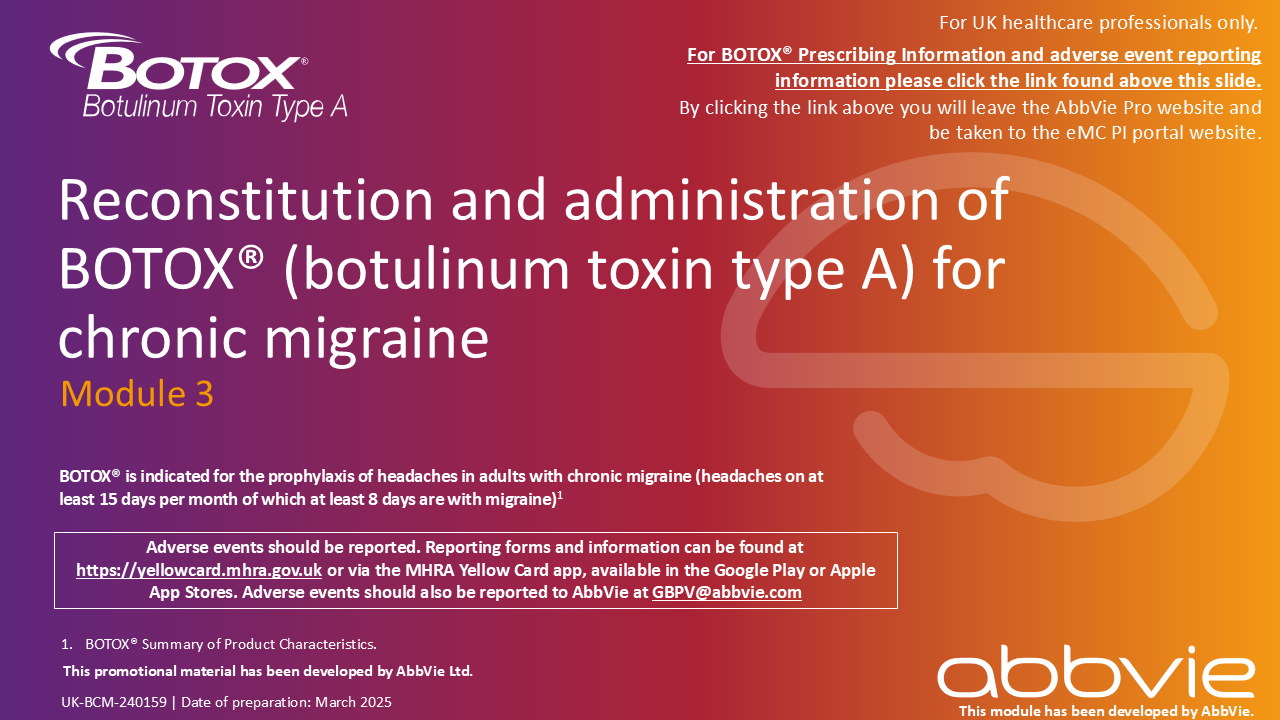 This module, designed for UK healthcare professionals involved in the management of patients with CM includes; the reconstitution and administration of BOTOX® for patients with CM, the PREEMPT injection paradigm and protocols, along with considerations for before, during and after the BOTOX® injection procedure.