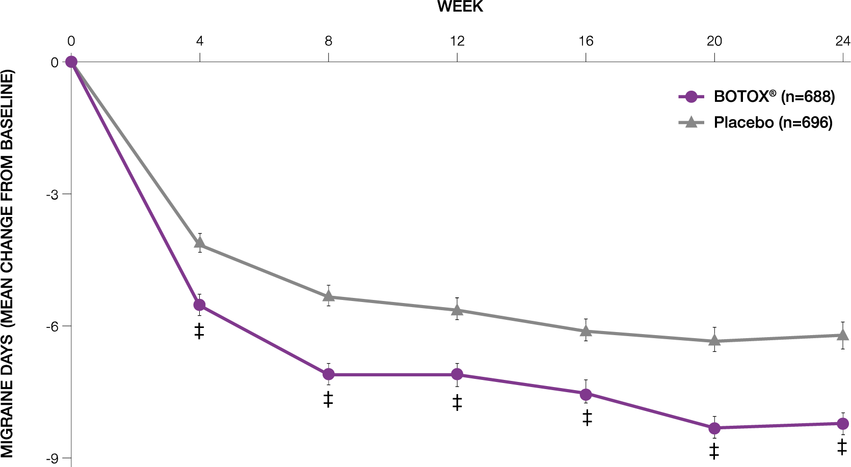 - BOTOX® significantly reduces the frequency of migraine days compared with placebo up to 24 weeks (p<0.001; N=1,384).7