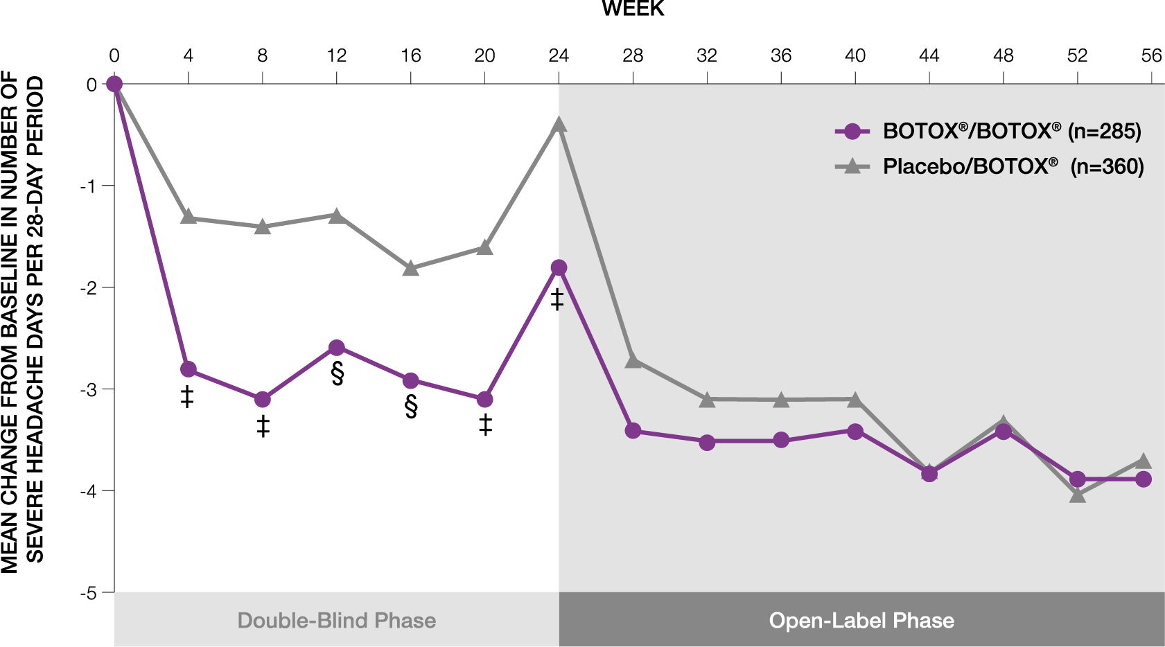 - BOTOX® significantly reduced the number of severe headache days experienced up to Week 24 compared with placebo.8