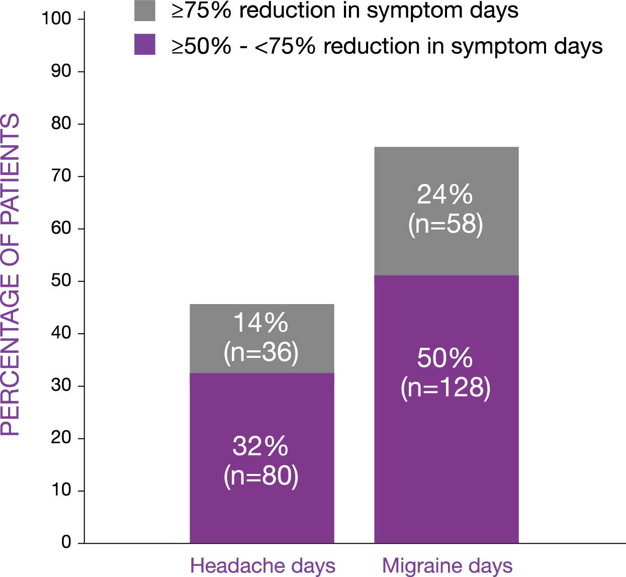 - reduced median headache days per month from 27 to 18 and median migraine days per month from 15 to 7, baseline versus after treatment (p<0.001)