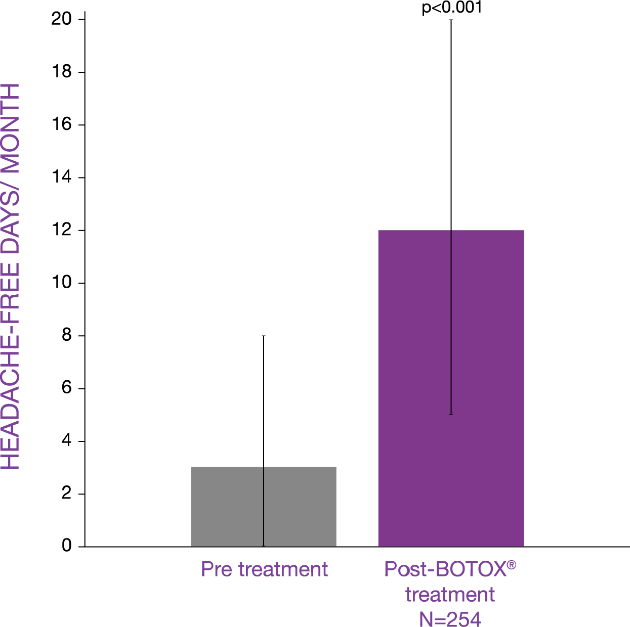 - significantly increased the number of monthly headache-free days, compared with pre-treatment, in people with chronic migraine (p<0.001)
