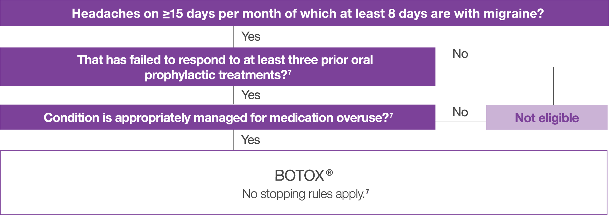 BOTOX® (botulinum toxin type A) is indicated for the prophylaxis of headaches in adults with chronic migraine (headaches on at least 15 days per month of which at least 8 days are with migraine).5