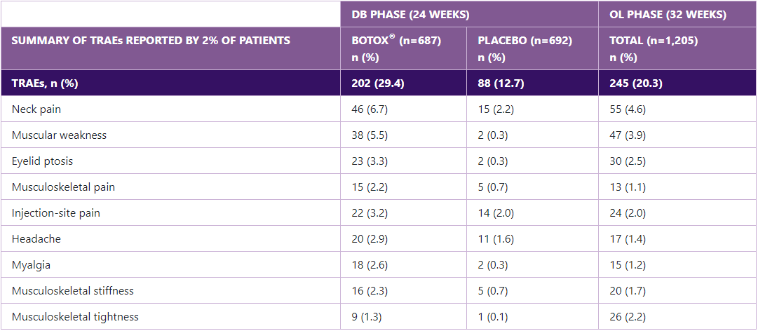 Please refer to the BOTOX® Summary of Product Characteristics for further information on adverse events, contraindications and special warnings and precautions for use.