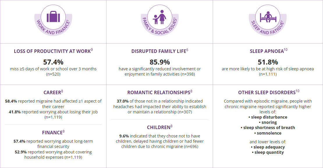 Migraine is associated with a substantial personal burden, resulting from headache-related disability, a high rate of comorbidities, reduced health-related quality of life and a concomitant financial burden.6,7 Migraine can also affect work productivity, interpersonal dynamics and psychological health and wellbeing, both for the patient and for their family.8 Unsurprisingly, it has been shown that this impact is greatest in families of people with chronic migraine.8