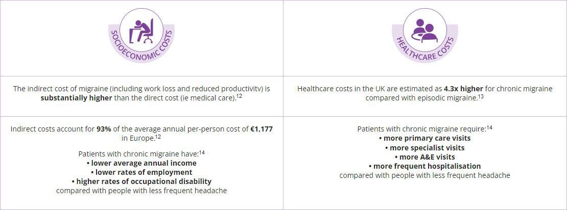 The economic burden of the disease reflects the higher disease severity and associated comorbidities of chronic migraine compared with episodic migraine.11