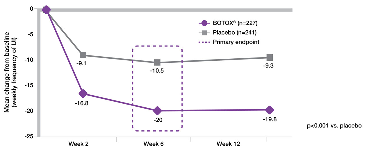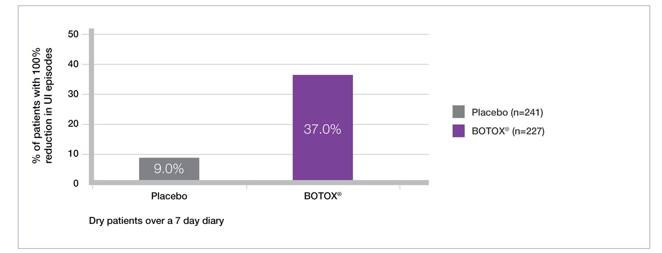 Study context: Two double-blind, placebo controlled, randomised phase 3 clinical studies, in 691 patients with urinary incontinence due to NDO. BOTOX®: n=227, placebo: n=241. Baseline weekly frequency of UI: BOTOX® 200U 32.4, placebo 31.5.5