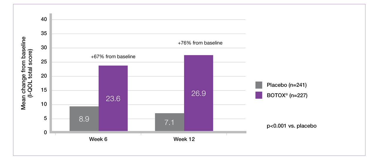 BOTOX® 200U demonstrates significant I-QOL improvements at weeks 6 and 12 versus placebo (secondary endpoint)5-7