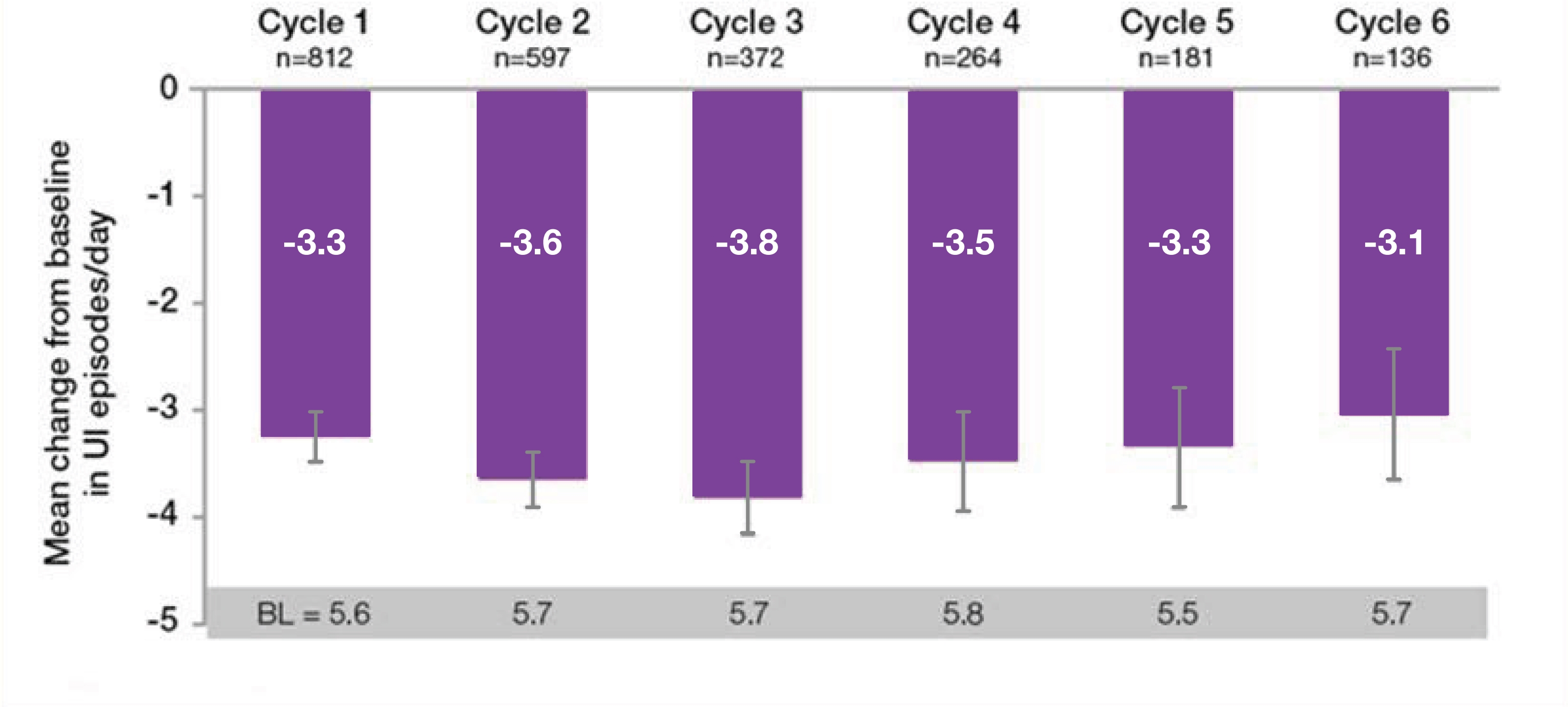 BOTOX® sustained reductions in daily episodees of UI and urgency from baseline, throughout the entire 3.5 year study period6