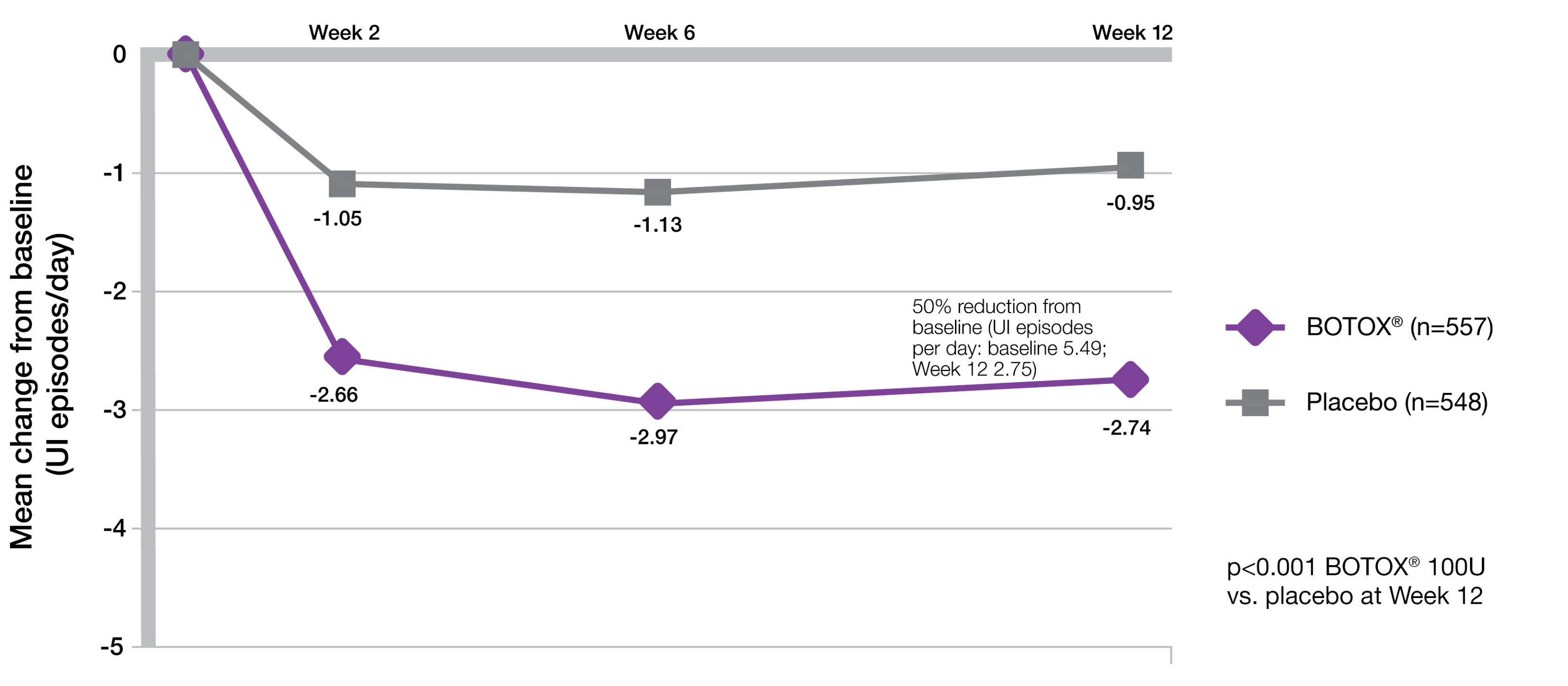 BOTOX® demonstrated significant reductions from baseline in daily UI episodes compared with placebo (-2.74 vs -0.95; p<0.001 vs placebo).5