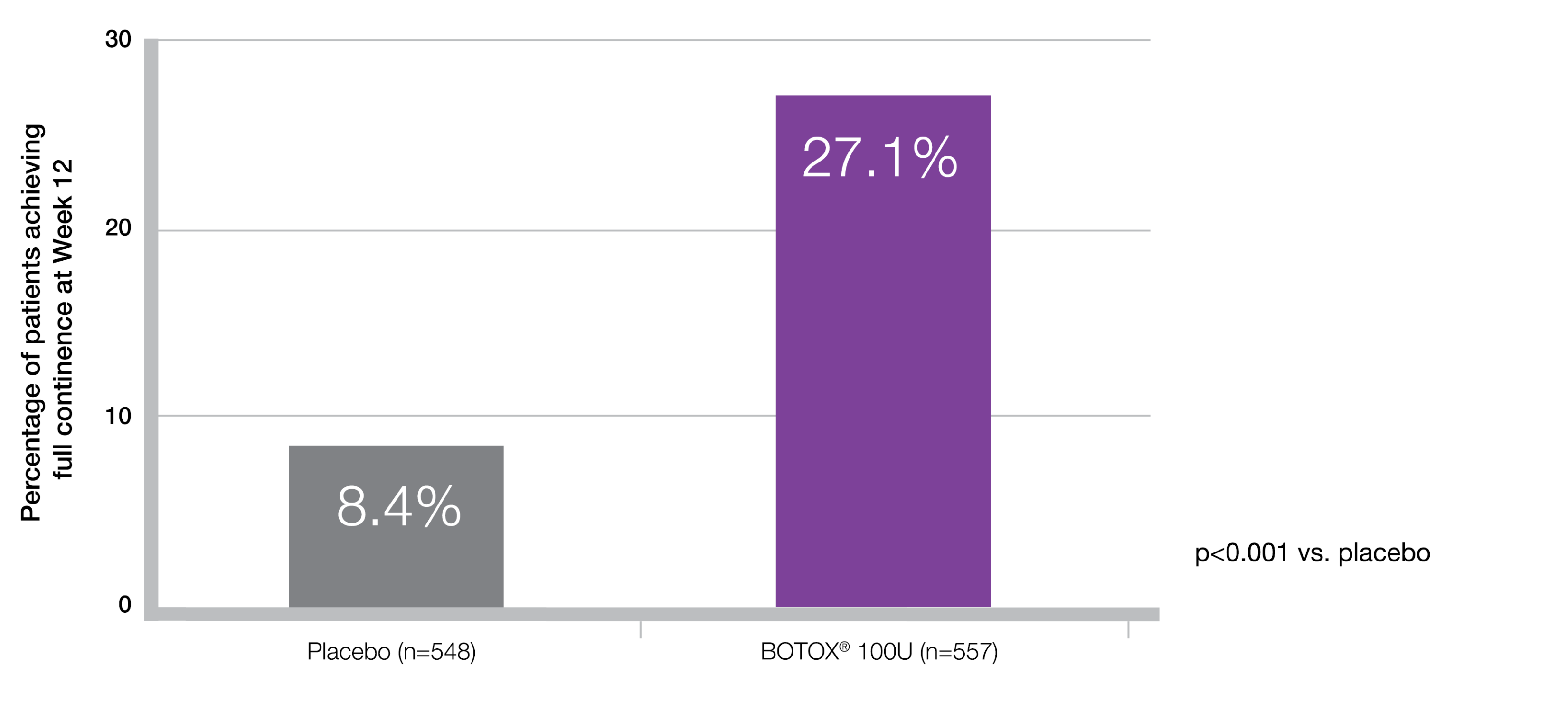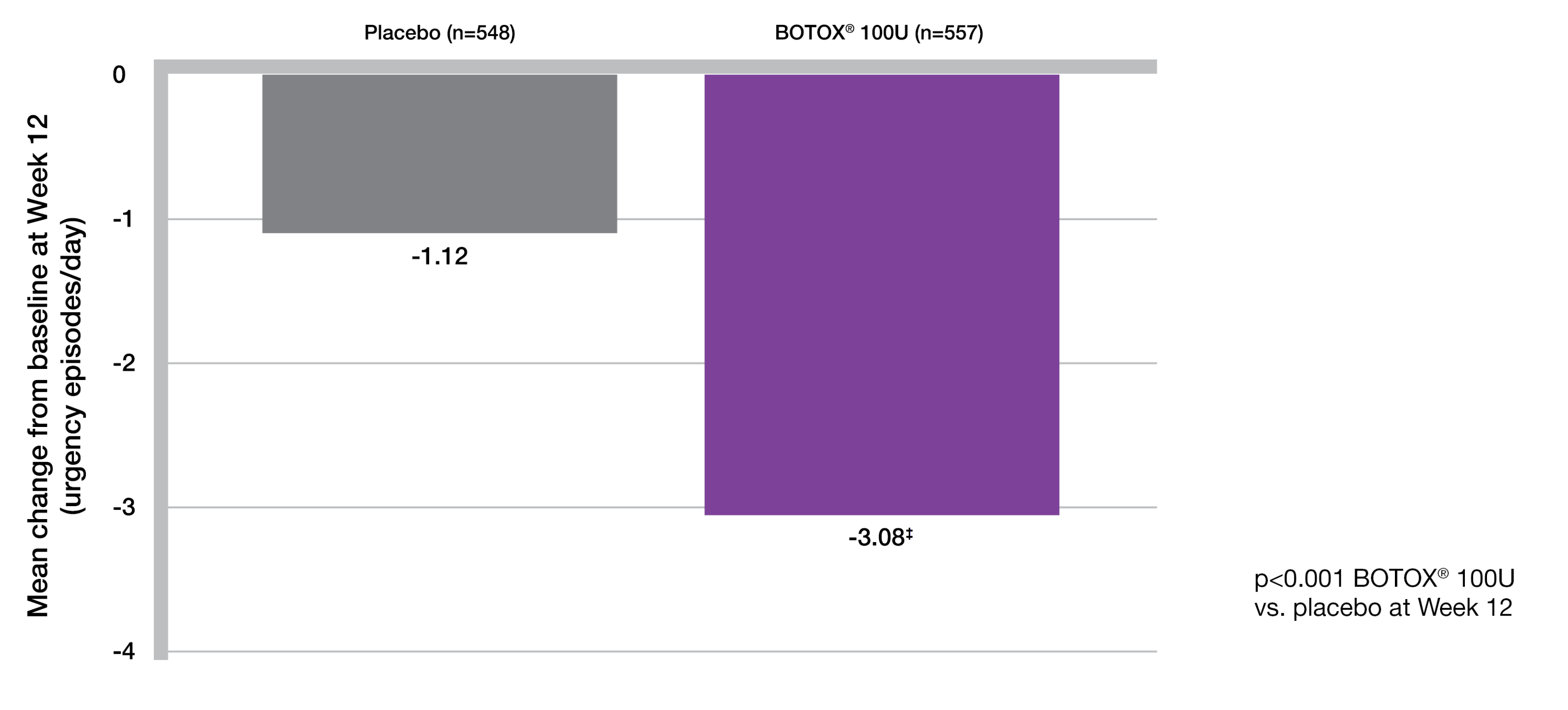 ‡Secondary endpoint. Mean baseline score: Placebo = 8.31/dey: BOTOX® 100U = 8.82/day. p<0.001 vs placebo. Co-primary end points were the change from baseline in the number of urinary incontinence episodes per day and the proportion of patients with a positive response on the treatment benefit scale at post-treatment week 12.5