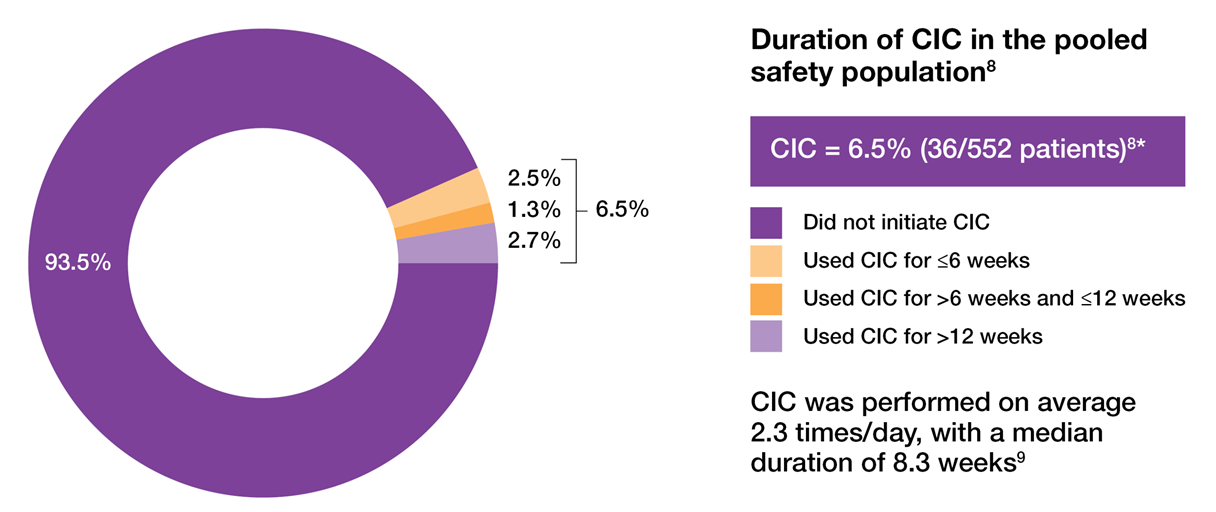 *Patients requiring CIC at any point during the treatment cycle. CIC was initiated if the PVR urine volume was ≥ 200ml and < 350ml with associated symptoms or if the PVR urine volume was ≥ 350ml, regardless of symptoms.8