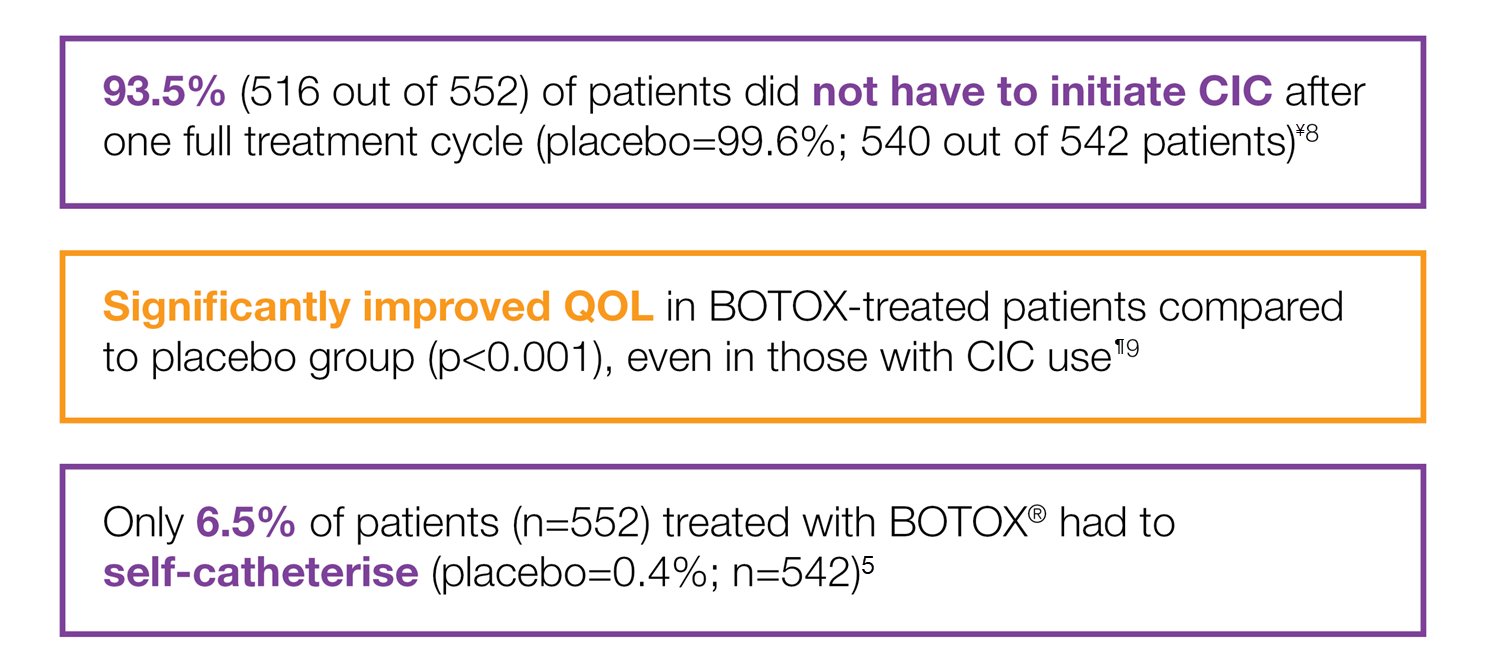 ¶Study context: A pooled analysis of two randomised controlled trials, to evaluate the impact of BOTOX® on quality of life and practical aspects of daily living. The co-primary endpoints were the mean reduction in UI episodes per day and the proportion of patients reporting a positive response on the treatment benefit scale.9