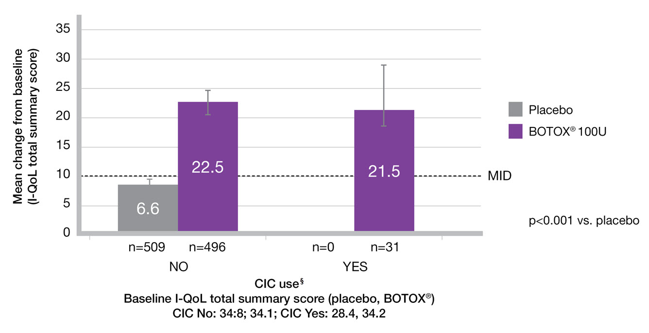 Study context: A pooled analysis of two randomised controlled trials, to evaluate the impact of BOTOX® on quality of life and practical aspects of daily living. Change from baseline in I-QoL total summary score in the subgroups by CIC use.9