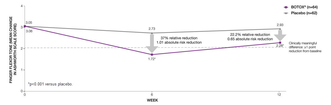 BOTOX® significantly reduced finger flexor tone compared to placebo at both Week 6 (primary endpoint) and 12 (additional endpoint)6