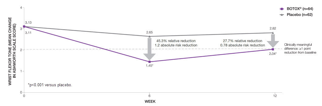 BOTOX® significantly* reduced wrist flexor tone compared to placebo at both Week 6 (primary endpoint) and 12 (additional endpoint)6