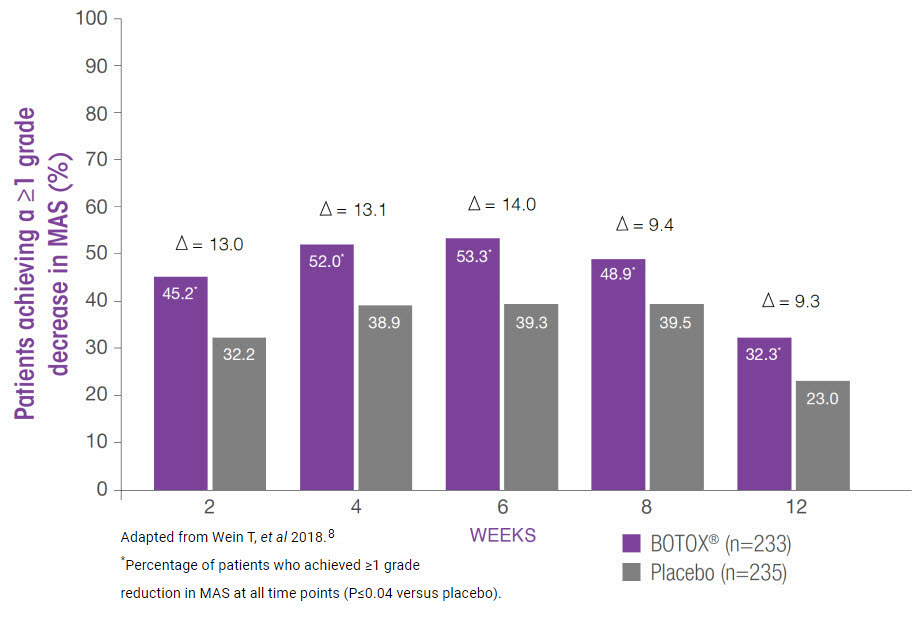 Study context: A phase 3, multicentre, randomised, double-blind, placebo-controlled trial (n=468, 12 weeks) with open-label extension (n=447, up to 60 weeks) evaluating the efficacy, safety and sustained benefit of BOTOX® in adults with post-stroke lower limb spasticity.8