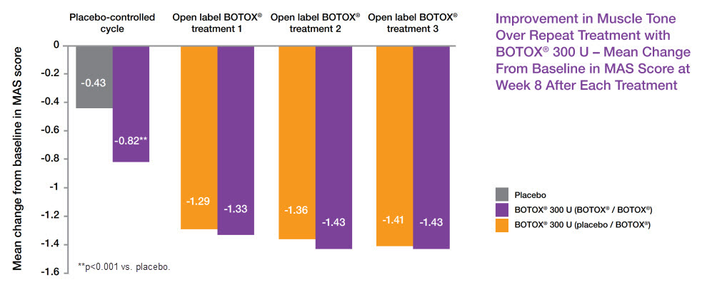 - The number of patients achieving a ≥1 grade decrease in ankle MAS continued to increase with repeated BOTOX® treatments during a subsequent 1-year open-label phase (additional endpoint)8
