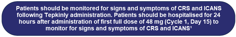CRS, ICANS, serious infections, TLS and tumour flare have also occurred in patients receiving Tepkinly. For further information and management of these adverse reactions, see the Safety section.