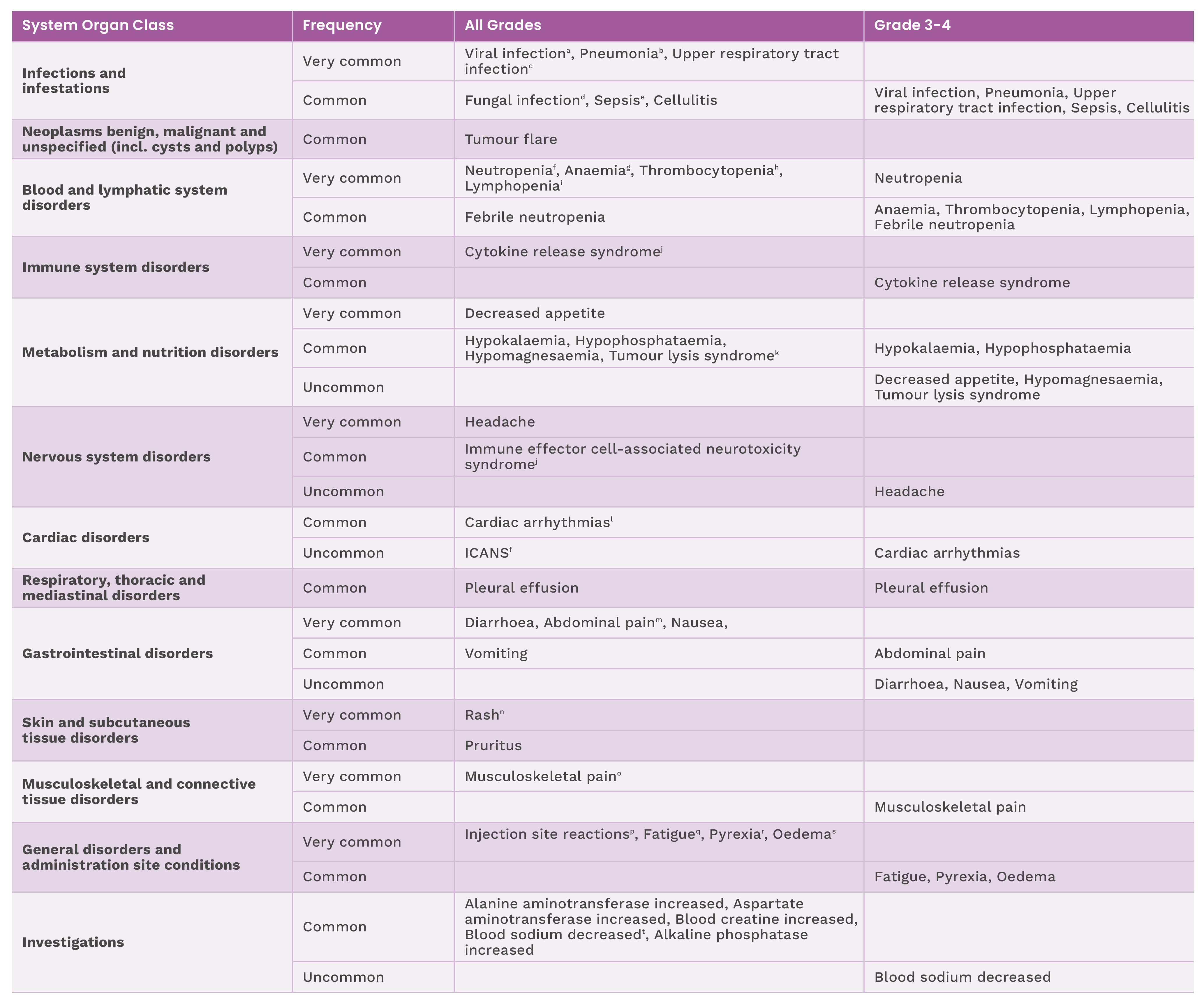 The safety of Tepkinly was evaluated in a non-randomised, single-arm study in 382 patients with R/R LBCL (n=167), follicular lymphoma (n=129) and follicular lymphoma (3-step step-up dose schedule n=86) after 2 or more lines of systematic therapy and included all the patients who enrolled to the 48 mg dose and received at least one dose of Tepkinly. The following adverse reactions have been reported with Tepkinly during clinical studies and post marketing experience.