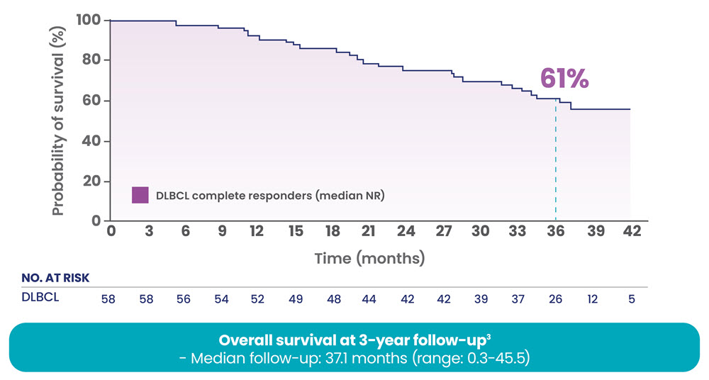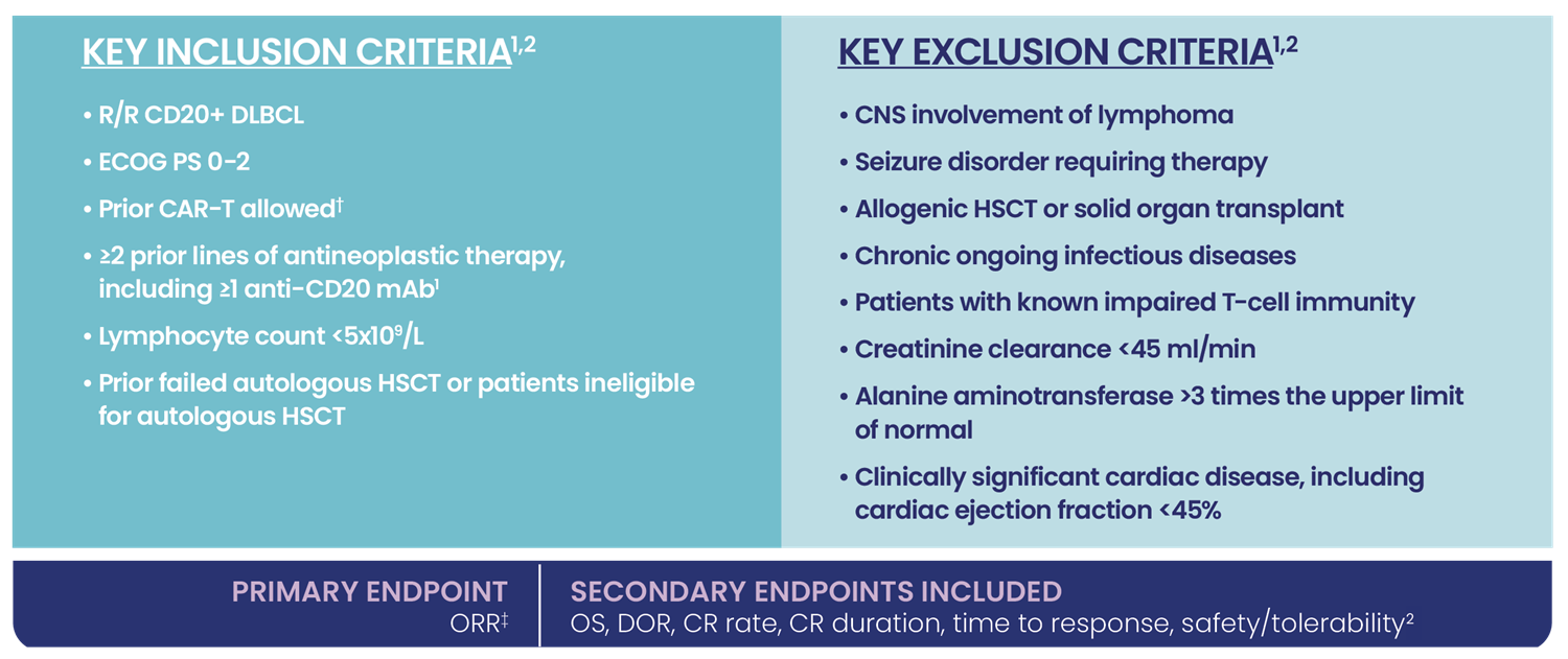 3L+=third-line plus; BsAB; bispecific antibody; CAR-T=chimeric antigen T cell; CD20=cluster of differentiation 20; CI=confidence interval; CNS=central nervous system; CR=complete response; CRS=cytokine release syndrome; DLBCL=diffuse large B-cell lymphoma; DOR=duration of response; ECOG PS=Eastern Cooperative Oncology Group performance status; FISH=fluorescence in situ hybridisation; HSCT=haematopoietic stem cell transplantation; ICANS=immune effector cell-associated neurotoxicity syndrome; mAb=monoclonal antibody; mDOCR=median duration of complete response; mDOR=median duration of response; NHL=non-Hodgkin lymphoma; NR=not reached; ORR=overall response rate; OS=overall survival; PR; partial response; R/R=relapsed/refractory; TLS=tumour lysis syndrome.