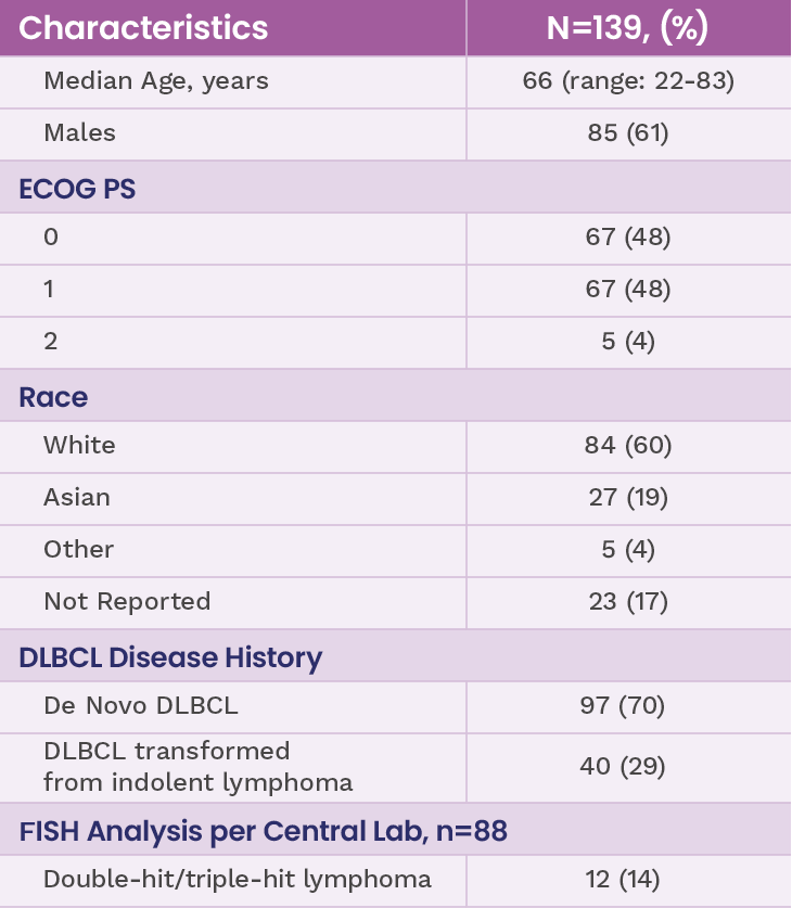 *EPCORE™ NHL-1 enrolled patients with ECOG status 0-2, de novo DLBCL, DLBCL transformed from indolent lymphoma, CAR-T naïve, prior CAR-T, and primary refractory disease.
