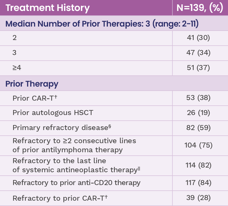 †Patients who had relapsed or were refractory to prior CAR-T cell therapy were eligible if ≥30 days since last CAR-T cell treatment.