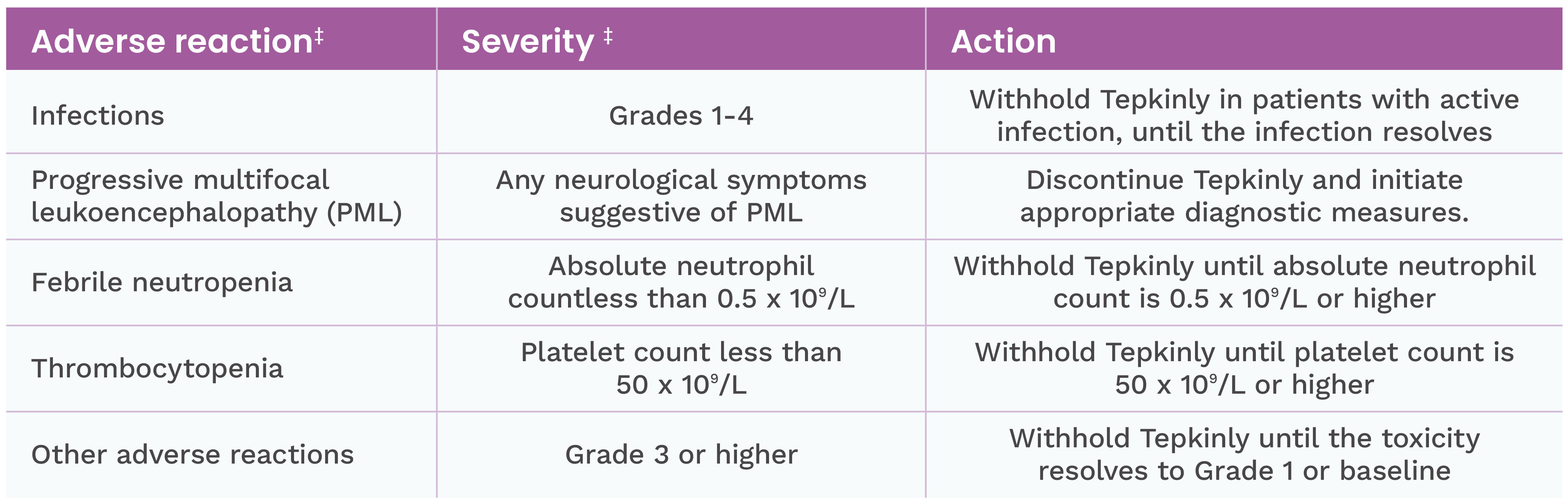 - 6.8% of patients in EPCORETM NHL-1 trial discontinued subcutaneous Tepkinly due to adverse reactions. Discontinuation of epcoritamab due to pneumonia occurred in 14 (3.7%) patients, viral infection in 8 (2.1%) patients, fatigue in 2 (0.5%) patients and CRS, ICANS, or diarrhoea occurred in 1 (0.3%) patient each.