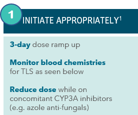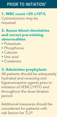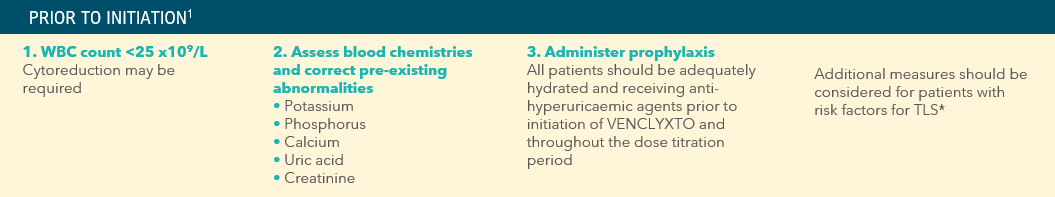 *Risk factors for TLS include circulating blasts, high burden of leukaemia involvement in bone marrow, elevated pre-treatment LDH levels, and reduced renal function.1