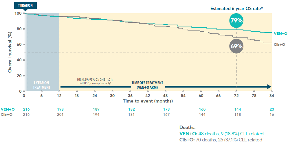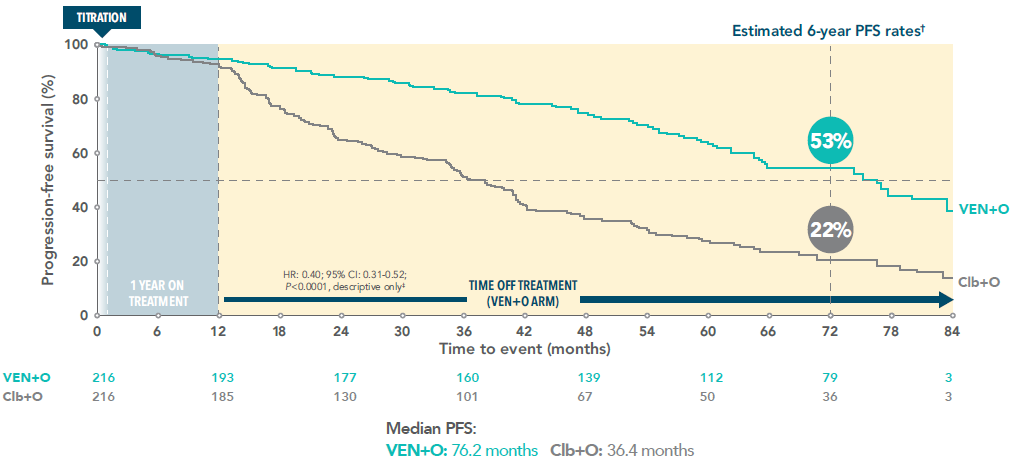 Over twice as many VEN+O patients remained progression-free vs Clb+O 6 years after initiating VEN+O treatment3