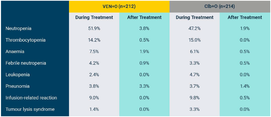 †Includes ‘neutrophil count decreased’. Rates of febrile neutropenia (grade ≥3): 1.9% for VEN+I vs 2.9% for Clb+O.