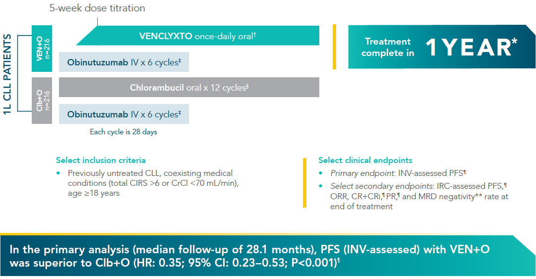 VENCLYXTO + obinutuzumab (VEN+O) vs chlorambucil + obinutuzumab (Clb+O)1,2*