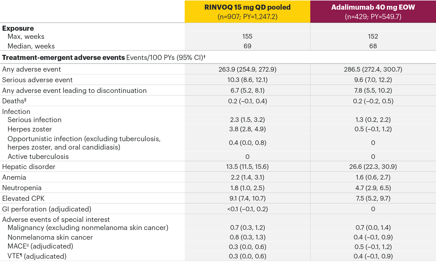 *In RA studies, patients who switched from placebo, adalimumab, MTX, or abatacept to RINVOQ were included in the RINVOQ analysis set from the start of RINVOQ, while those who switched from RINVOQ to adalimumab were included in the adalimumab analysis set from the start of adalimumab and were censored at the time of switch. MTX monotherapy was censored at time of rescue to combination therapy (addition of RINVOQ).