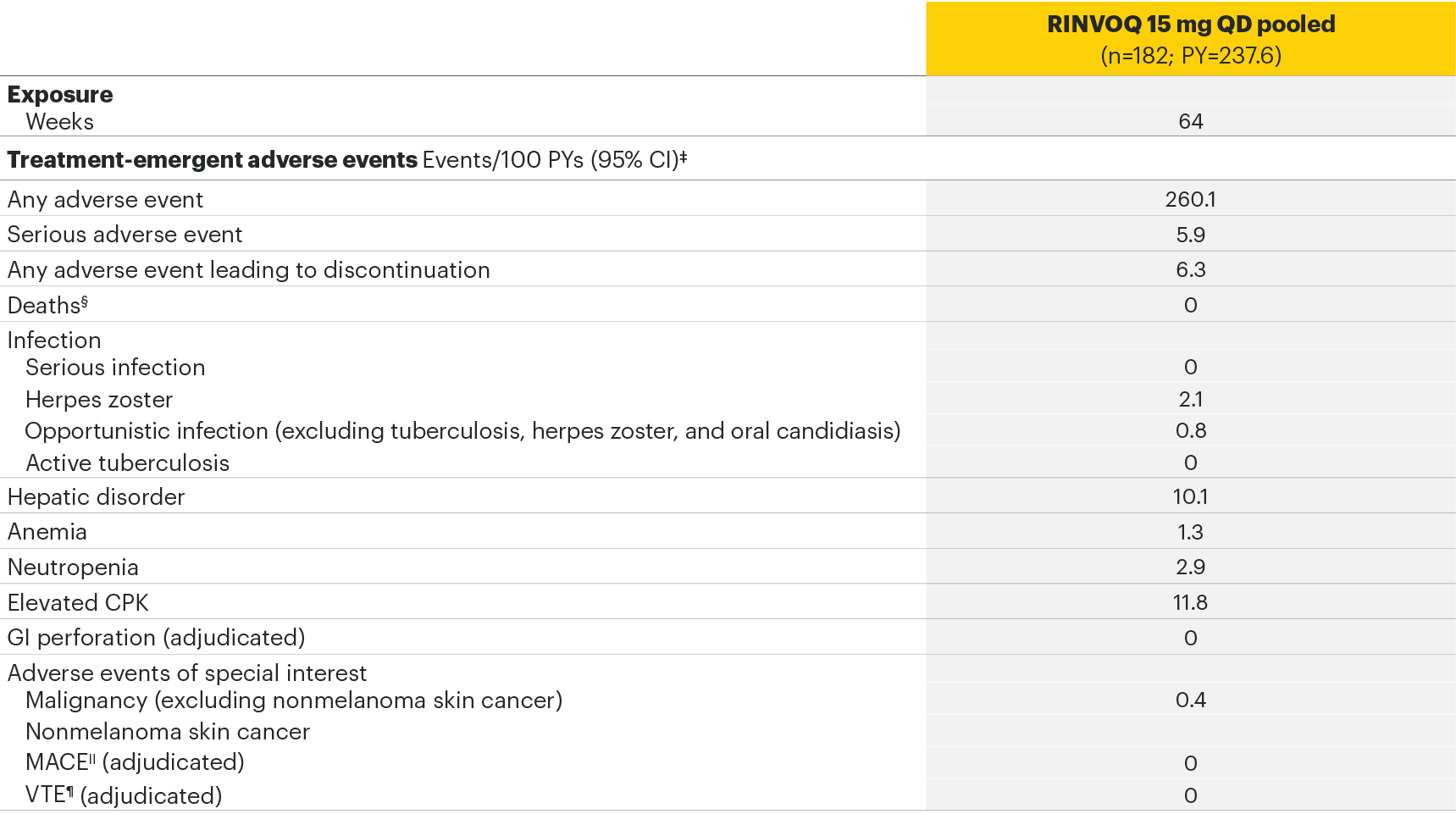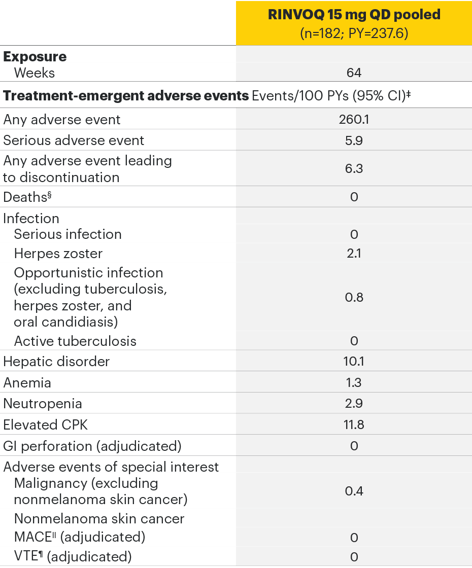 TEAEs observed with RINVOQ 15 mg in 3 separate safety data sets in RA, PsA, and AS