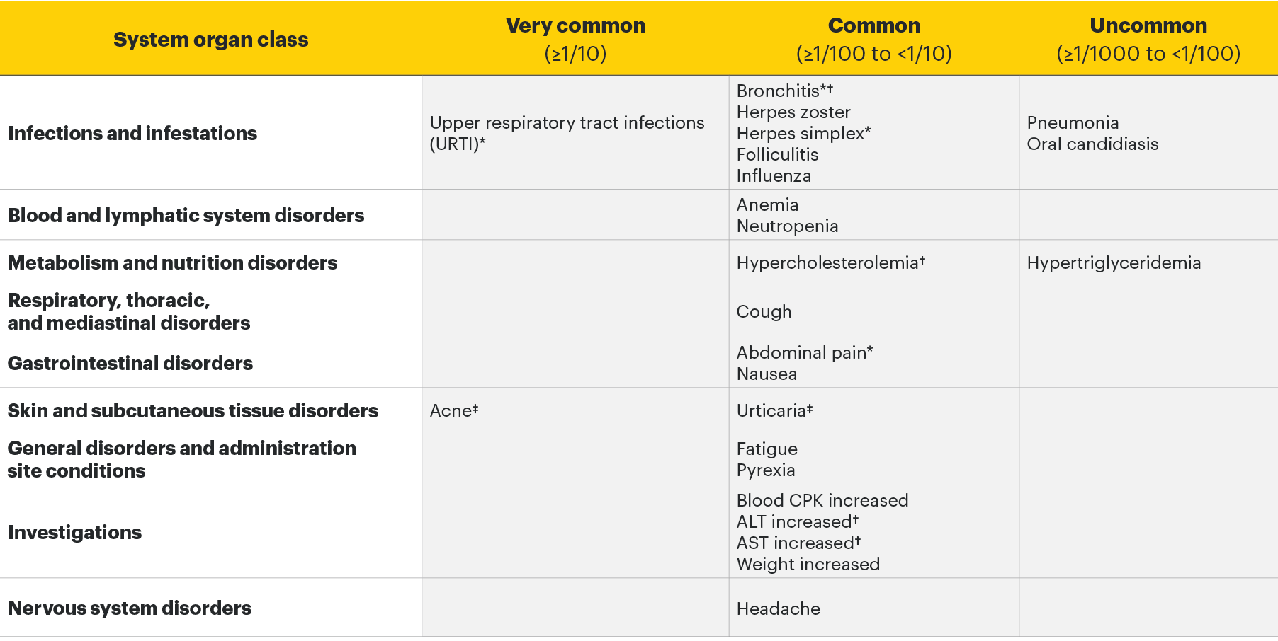 Most common adverse drug reactions:1 The most commonly reported adverse drug reactions were upper respiratory tract infections, blood creatine phosphokinase (CPK) increased, alanine transaminase (ALT) increased, bronchitis, nausea, cough, aspartate transaminase (AST) increased, and hypercholesterolaemia. The most common serious adverse reactions were serious infections.