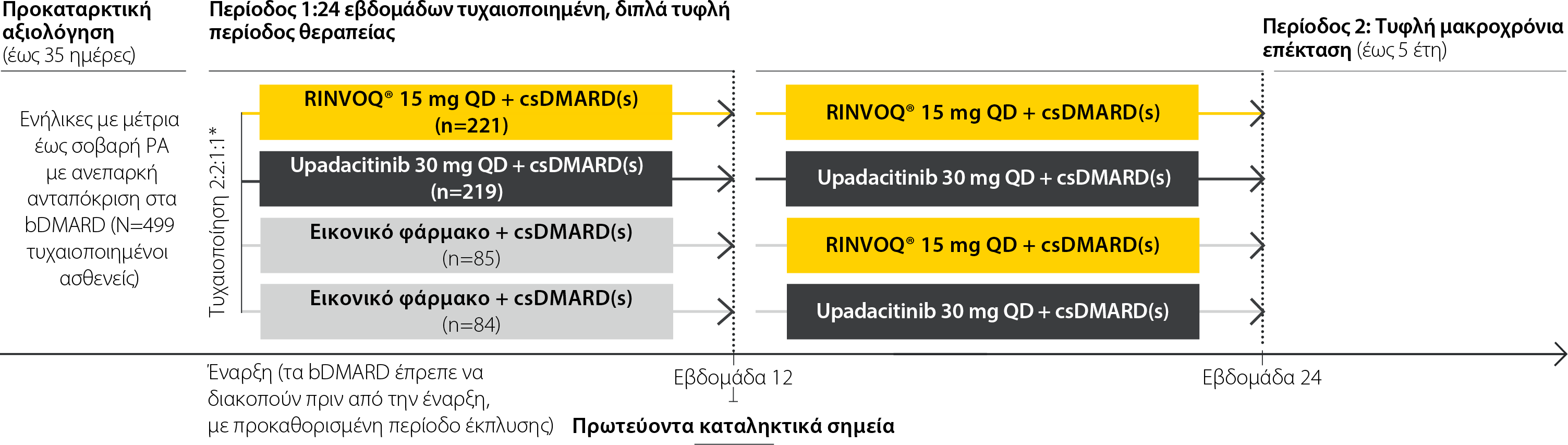 *Η διαστρωμάτωση της τυχαιοποίησης πραγματοποιήθηκε με βάση τον αριθμό προηγούμενων bDMARDs με τα οποία δεν επιτεύχθηκε ανταπόκριση (1 -2 με ίδιο μηχανισμό δράσης έναντι ≥3 με τον ίδιο μηχανισμό δράσης ή τουλάχιστον 2 βιολογικά φάρμακα με διαφορετικούς μηχανισμούς δράσης).
