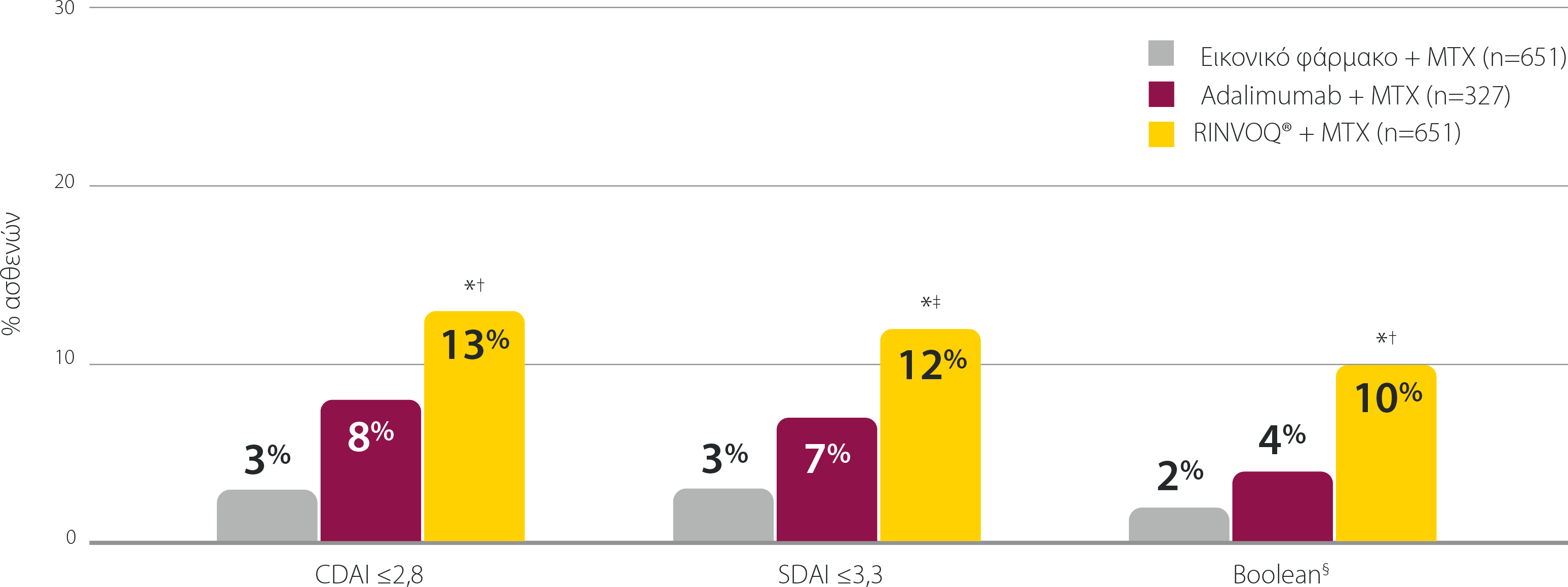 §Υποδηλώνει σύγκριση ανωτερότητας του RINVOQ® + MTX έναντι του συνδυασμού adalimumab + MTX με έλεγχο πολλαπλότητας.