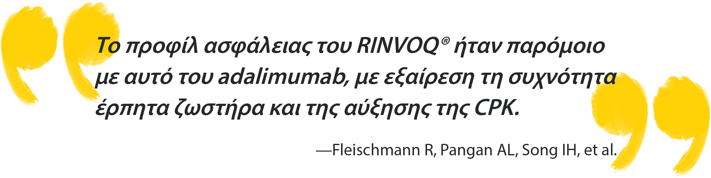 *Κριτήρια διάσωσης: Τις εβδομάδες 14,18, και 22, οι ασθενείς που έλαβαν adalimumab ή εικονικό φάρμακο μεταπήδησαν σε αγωγή με RINVOQ® και οι ασθενείς που λάμβαναν RINVOQ® μεταπήδησαν σε adalimumab εάν παρουσίαζαν βελτίωση <20% στον αριθμό των ευαίσθητων αρθρώσεων και τον αριθμό των διογκωμένων αρθρώσεων συγκριτικά με την αρχική εκτίμηση. Την εβδομάδα 26, όλοι οι υπόλοιποι ασθενείς που λάμβαναν εικονικό φάρμακο, οι οποίοι δεν έλαβαν θεραπεία διάσωσης, μεταπήδησαν στο RINVOQ®, και οι ασθενείς που λάμβαναν RINVOQ® ή adalimumab μεταπήδησαν σε adalimumab και RINVOQ®, αντίστοιχα, εάν ο δείκτης CDAI ήταν >10.