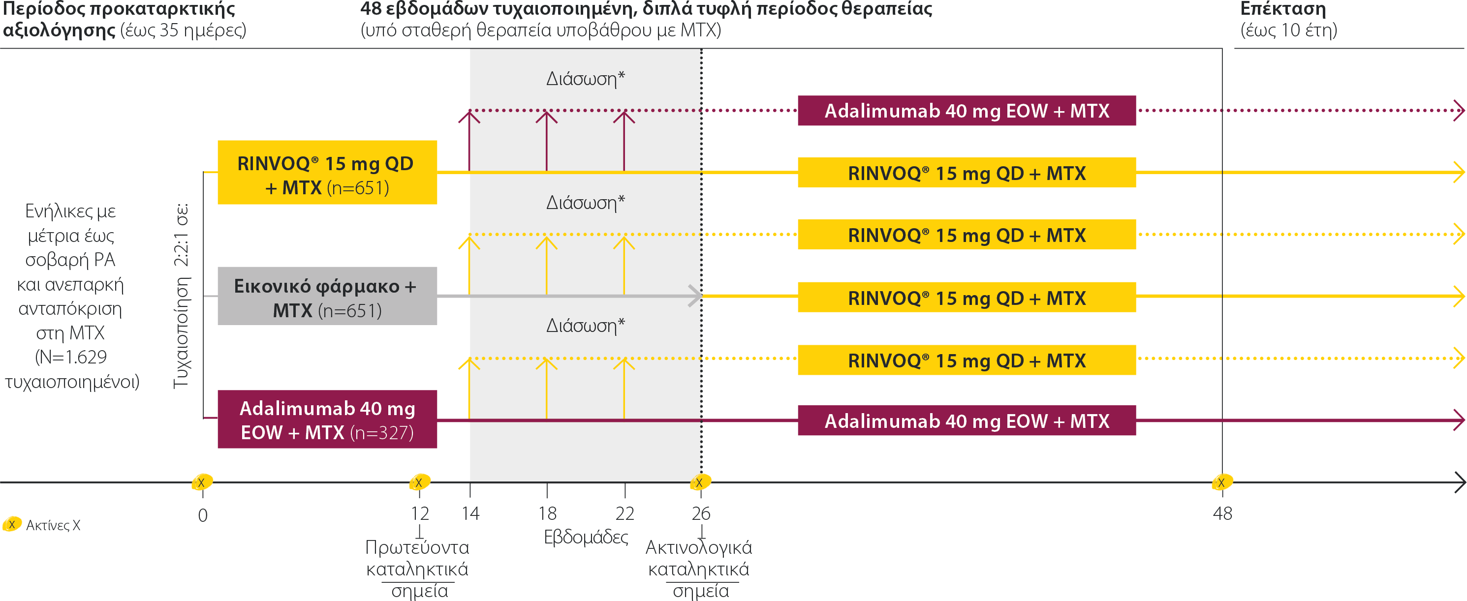 Οι θεραπευτικές ομάδες παρουσιάζονται βάσει της αρχικής τυχαιοποίησης. Για την ομάδα του εικονικού φαρμάκου, όλα τα δεδομένα την εβδομάδα 48 υπολογίστηκαν με γραμμική αναγωγή. Τα ακτινογραφικά δεδομένα που συλλέχθηκαν κατά την αλλαγή θεραπείας ή τη διακοπή του εικονικού φαρμάκου (για τους ασθενείς που διέκοψαν το εικονικό φάρμακο) χρησιμοποιήθηκαν για την αναγωγή. Συγκεκριμένα, για τους ασθενείς που λάμβαναν το εικονικό φάρμακο, οι οποίοι μεταπήδησαν στο RINVOQ® την εβδομάδα 26, η ακτινογραφία της εβδομάδας 26 χρησιμοποιήθηκε για αναγωγή, προκειμένου να υπολογιστούν τα δεδομένα της εβδομάδας 48. Για τους ασθενείς που τυχαιοποιήθηκαν να λάβουν το RINVOQ® ή adalimumab που έλαβαν θεραπεία διάσωσης, τα δεδομένα της εβδομάδας 48 υπολογίστηκαν επίσης με γραμμική αναγωγή, χρησιμοποιώντας τα ακτινογραφικά δεδομένα που συγκεντρώθηκαν κατά την αλλαγή της θεραπείας.1-3