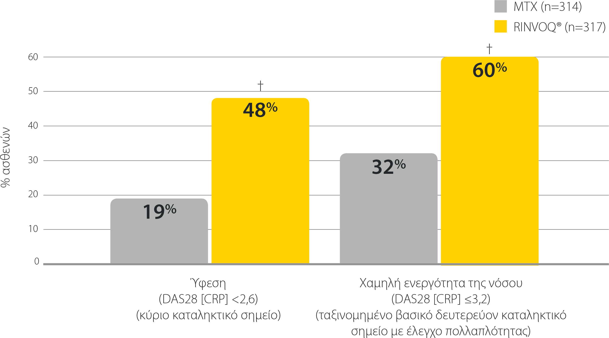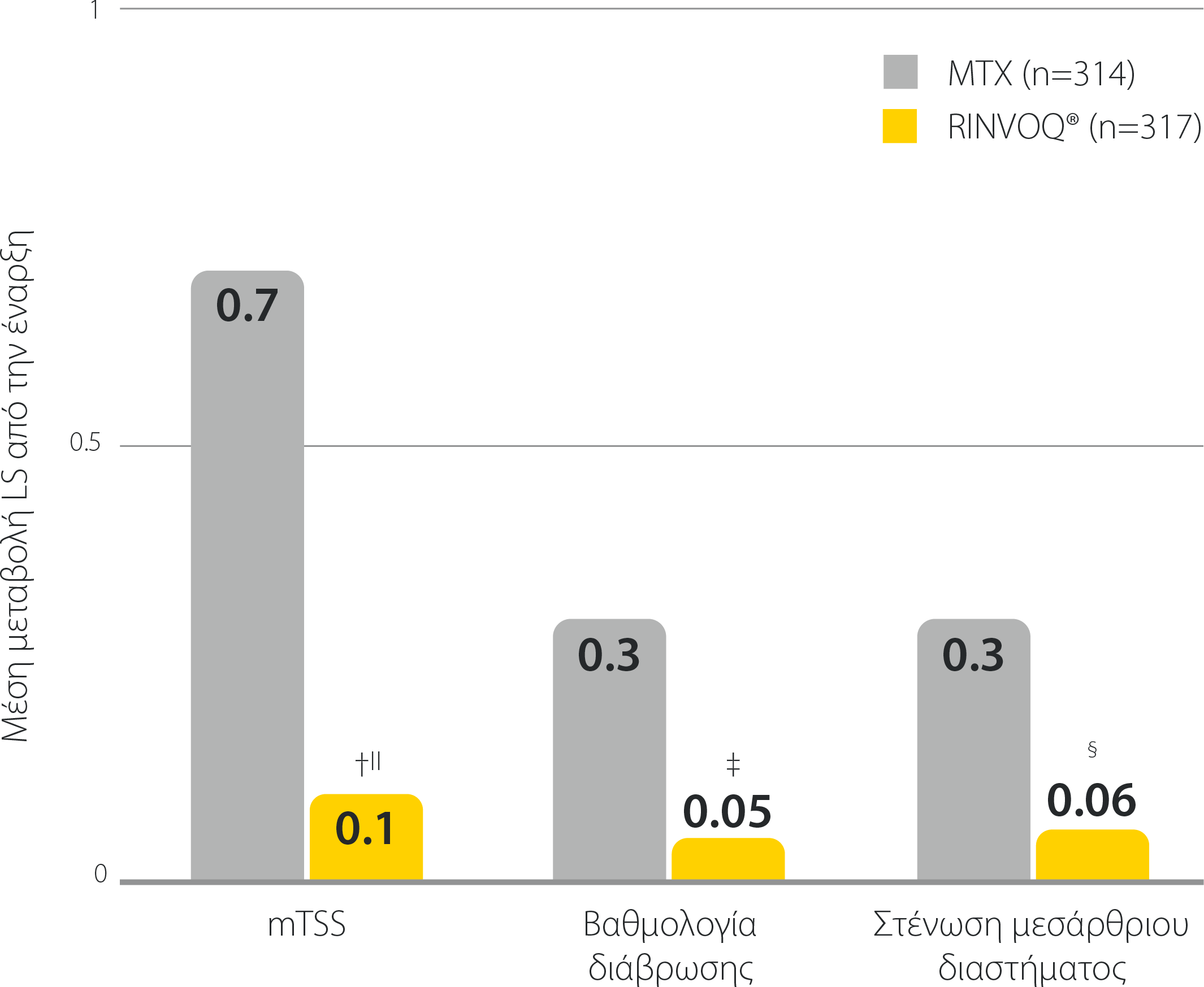 Η μεταβολή στην mTSS για το RINVOQ® έναντι της MTX την εβδομάδα 24 ήταν ταξινομημένο δευτερεύον καταληκτικό σημείο με έλεγχο πολλαπλότητας. Όλα τα υπόλοιπα δεδομένα που παρουσιάζονται για το RINVOQ® συγκριτικά με τη MTX ήταν προκαθορισμένα μη ταξινομημένα καταληκτικά σημεία χωρίς έλεγχο πολλαπλότητας˙ παρέχονται οι τιμές P.