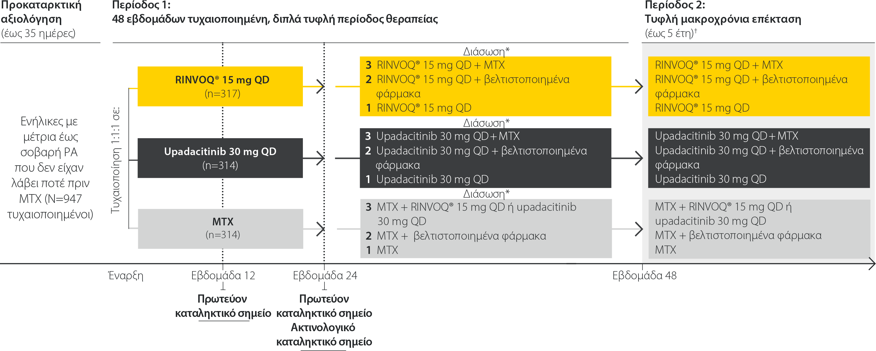 *Πρωτόκολλο διάσωσης από την εβδομάδα 26: ομάδα 1, εάν CDAI ≤2,8, οι ασθενείς συνέχισαν το φάρμακο της μελέτης που τους χορηγήθηκε αρχικά˙ ομάδα 2, για βελτίωση >20% από την αρχική εκτίμηση στον αριθμό των ευαίσθητων αρθρώσεων (TJC), και τον αριθμό των διογκωμένων αρθρώσεων (SJC), αλλά για CDAI >2,8, οι θεραπείες υποβάθρου βελτιστοποιήθηκαν˙ ομάδα 3, για βελτίωση <20%από την αρχική εκτίμηση στις τιμές TJC και SJC, και CDAI >2,8, προστέθηκε η χορήγηση RINVOQ® 15 mg ή upadacitinib 30 mg με εκ νέου τυχαιοποίηση σε αναλογία 1:1 για τους ασθενείς που αρχικά τυχαιοποιήθηκαν να λάβουν MTX, και η χορήγηση MTX προστέθηκε για τους ασθενείς που αρχικά τυχαιοποιήθηκαν να λάβουν RINVOQ® 15 mg ή upadacitinib 30 mg.