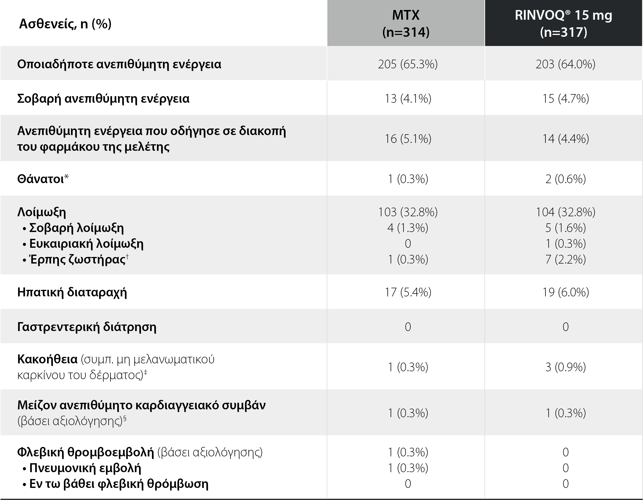 *Θάνατοι: Στην ομάδα της μεθοτρεξάτης, υπήρξε 1 αιφνίδιος καρδιαγγειακός θάνατος. Στην ομάδα του RINVOQ® 15 mg, σημειώθηκε 1 καρδιαγγειακός θάνατος, 1 θάνατος λόγω μεταστατικού κακοήθους μελανώματος.