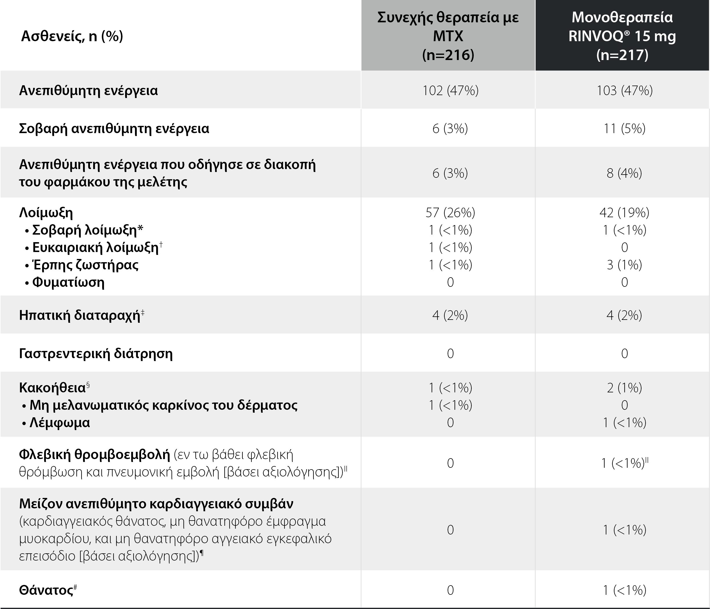 *Σοβαρή λοίμωξη: Στην ομάδα της μεθοτρεξάτης υπήρξε 1 συμβάν ουροσήψης. Στην ομάδα του RINVOQ® 15 mg, παρατηρήθηκε 1 απόστημα άκρου.