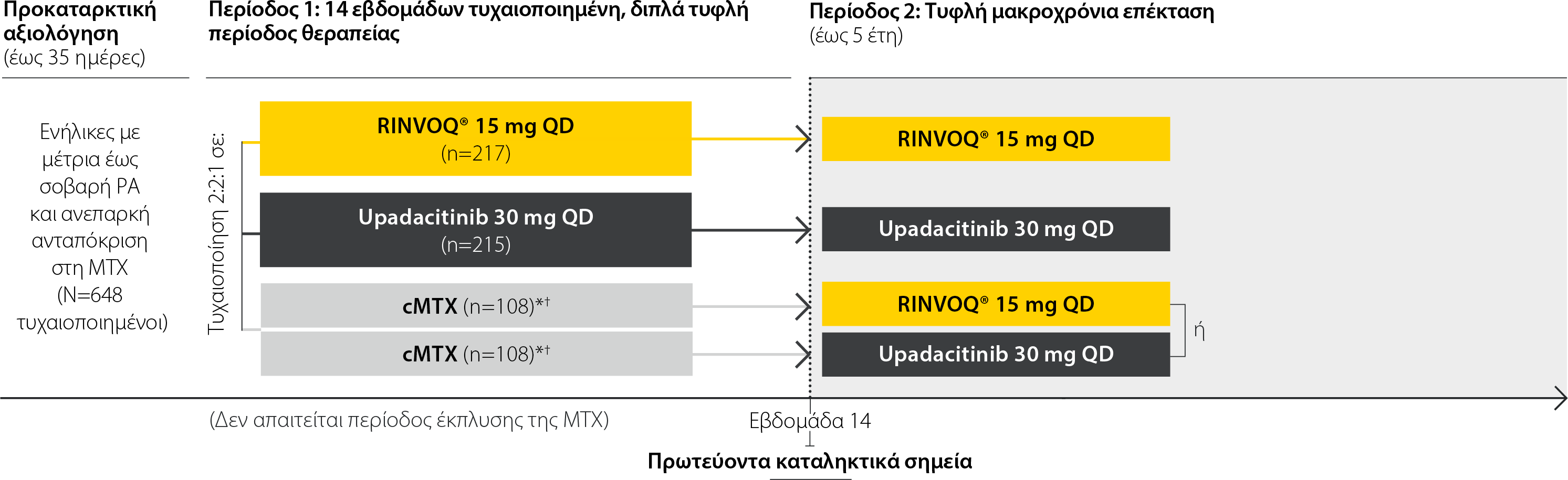 *Για την κύρια ανάλυση την εβδομάδα 14, πραγματοποιήθηκαν συγκρίσεις της δόσης του RINVOQ® 15 mg και του upadacitinib 30 mg έναντι της cMTX, συνδυάζοντας δεδομένα από τις δύο ομάδες της cMTX.