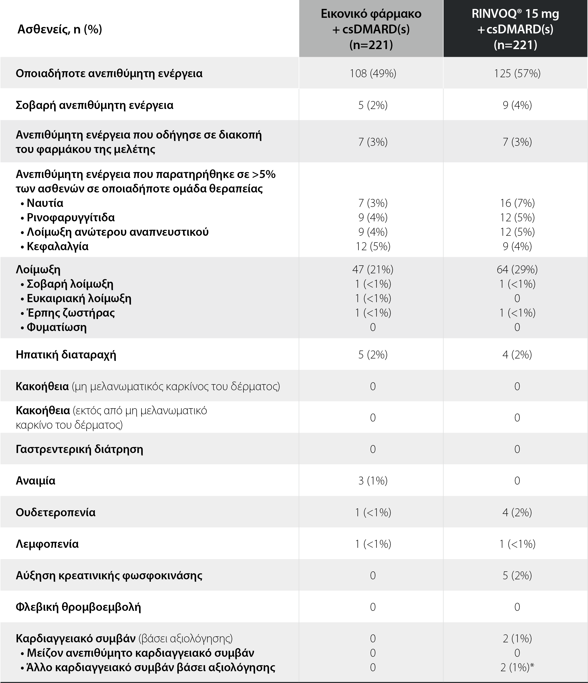 - Είχαν λάβει csDMARDs για ≥3 μήνες και λάμβαναν σταθερή δόση για ≥4 εβδομάδες πριν από την έναρξη της μελέτης.